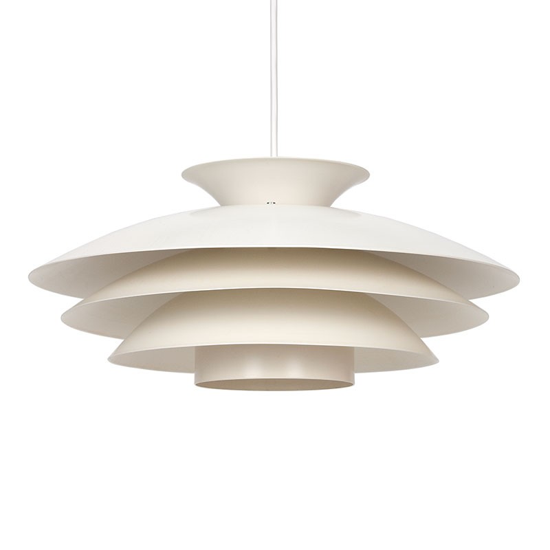 Vintage hanglamp uit Denemarken. Mooi typisch Deens ontwerp, afgeleid van de bekende modellen van Poul Henningsen. De conditie is goed, geen deukjes of krassen, bedrading vervangen. De afmetingen zijn 38 cm in diameter en 16,5 cm hoog.