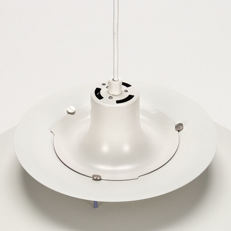 Hanglamp ontworpen door Poul Henningsen in 1958. De vintage lamp is uitgebracht door Louis Poulsen, dit exemplaar is een editie uit de midden jaren zeventig-tachtig ( dichte bovenzijde). Witte uitvoering met rode, blauwe en paarse details in het hart van de lamp. Prachtig, tijdloze hanglamp, die erg sfeervol licht geeft. De conditie is goed, enkel minimale gebruikssporen, zie details. De afmetingen zijn 50 cm in diameter en 28,5 cm hoog.