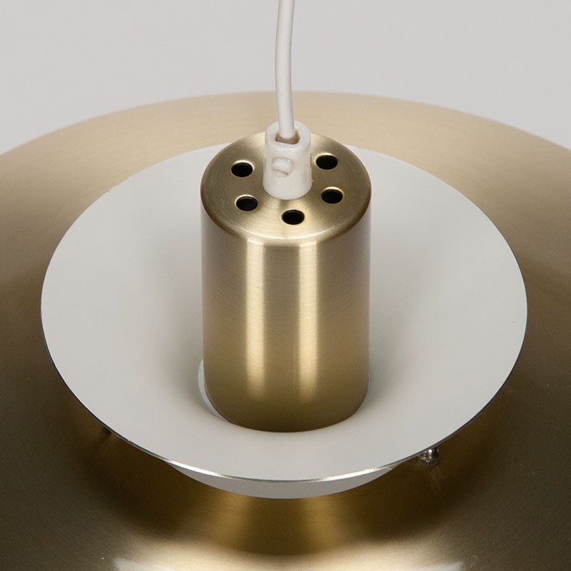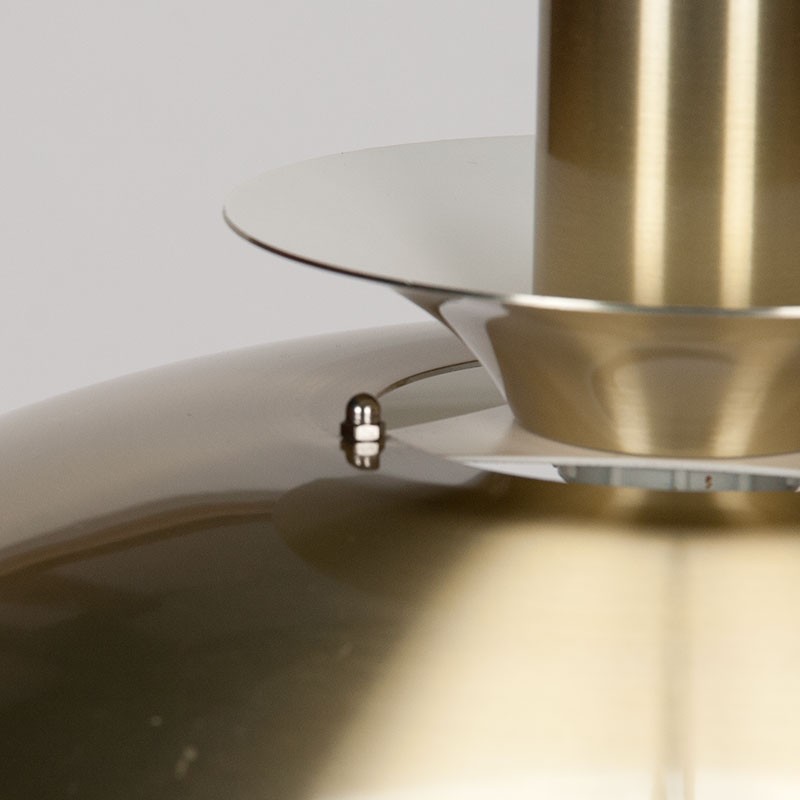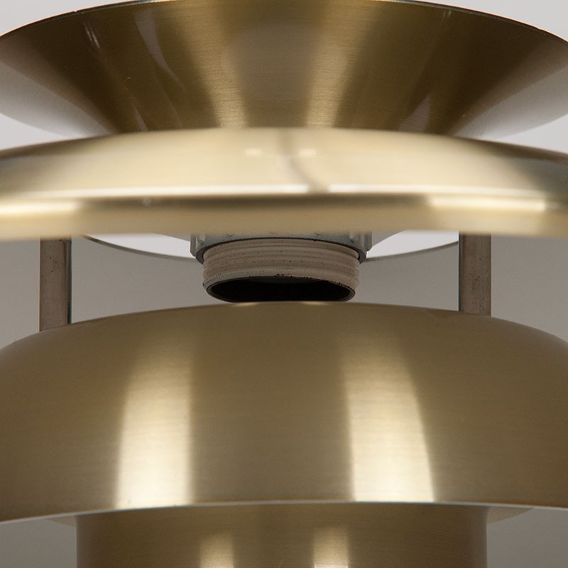 Deense messing kleurige hanglamp van Lyskaer Belysning. De vintage lamp is opgebouwd uit verschillende schalen/ schijven. De conditie is goed gezien de leeftijd, geen deukjes minimale gebruikssporen. De afmetingen zijn 37 cm in diameter en 22 cm hoog.