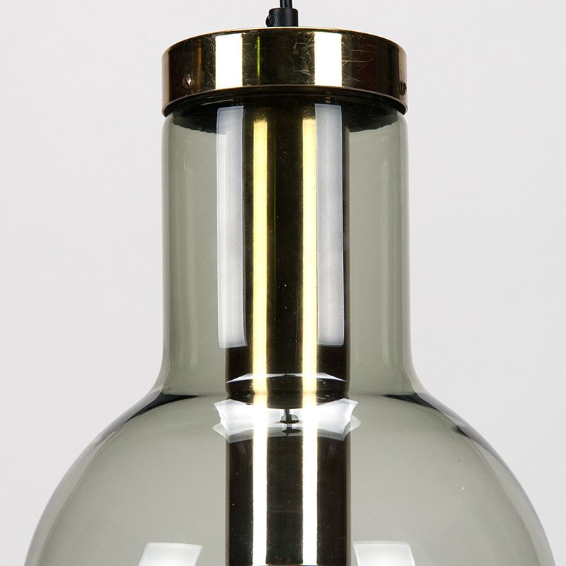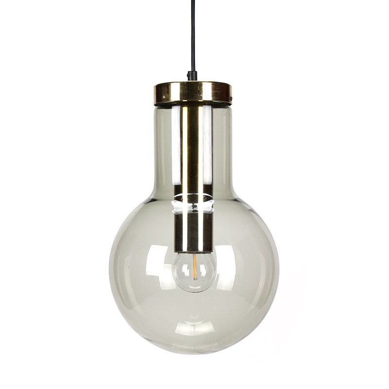Hanglamp uit de midden jaren zestig van het Nederlandse merk Raak Amsterdam. Model wordt ook wel Maxi-globe genoemd. Vintage hanglamp van grijs-getint glas gecombineerd met messing. De conditie is goed, bedrading vervangen. De afmetingen zijn 23 cm in diameter en 35 cm hoog.
