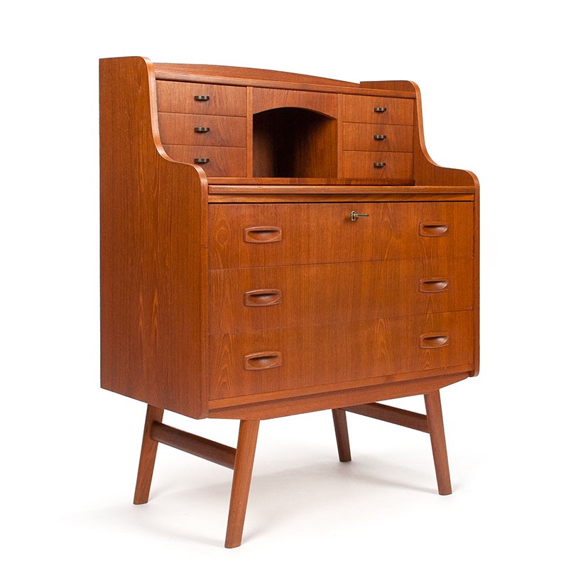 Vintage secretaire uit de vijftiger jaren, Denemarken. Model met een uitschuifbaar werkblad, en diverse grote en kleine lades. Leuk detail zijn de messing greepjes aan de kleine lades en de schuine poten. De conditie is goed, minimale gebruikssporen, zie details. De afmetingen zijn 80 cm breed, 43 cm diep en 104,5 cm hoog.