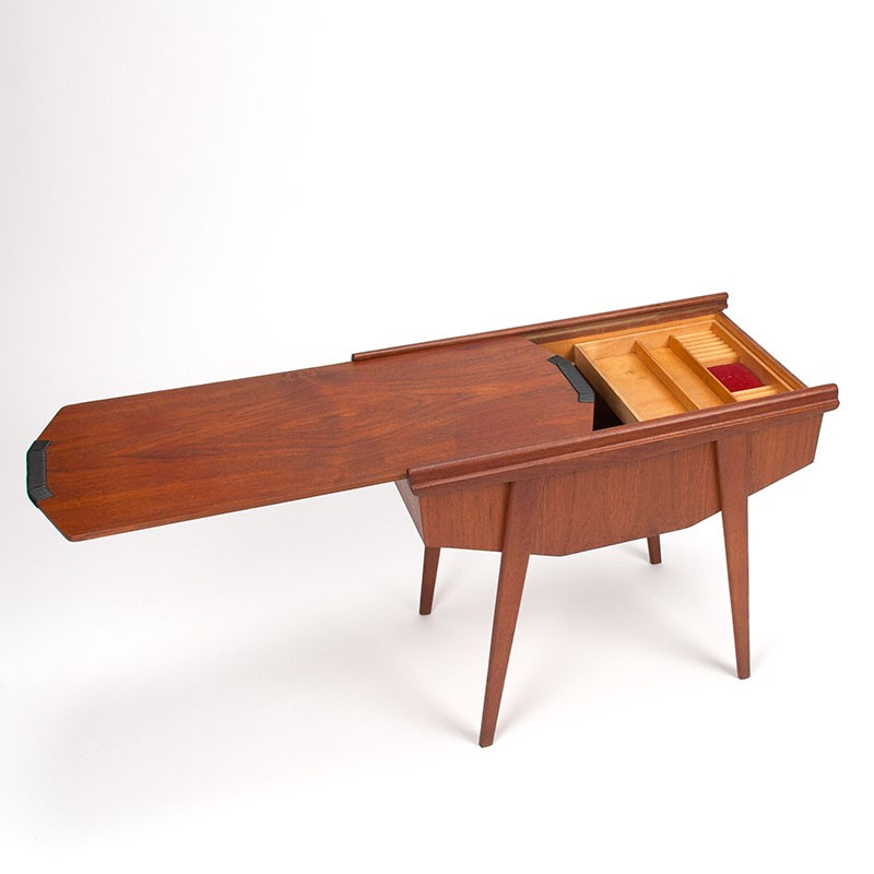 Deens naaigerei tafeltje uit de eind vijftiger jaren. Mooi vintage model op iets schuin staande pootjes. De bovenzijde kan worden open geschoven waarmee een los compartiment zichtbaar wordt en een open ruimte. De conditie is goed, enkel minimale gebruikssporen, zie details. De afmetingen zijn 76 cm lang, 35,5 cm breed en 52,5 cm hoog.