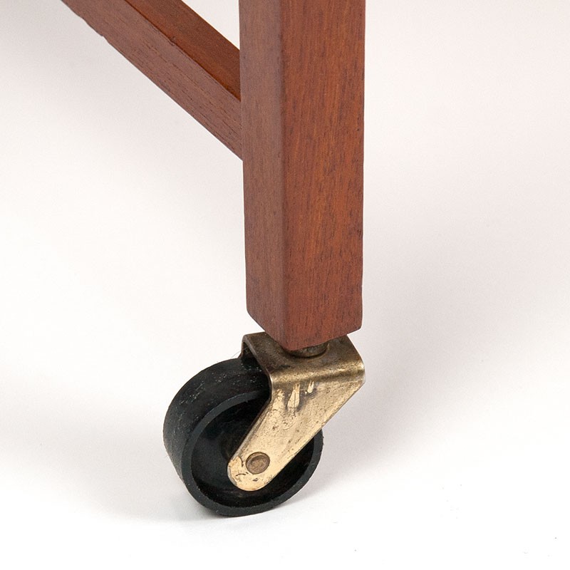 Naaigerei kastje uit de midden jaren zestig, Denemarken. Mooi strak vormgegeven model met een suede opbergruimte en lade met verschillende compartimenten. Het geheel is uitgevoerd in teakhout en staat op kleine wieltjes. De conditie is goed, minimalen gebruikssporen, zie details. De afmetingen zijn 66 cm breed, 43 cm diep en 53 cm hoog.