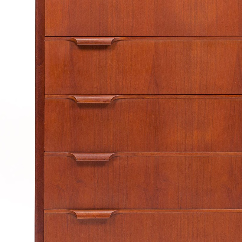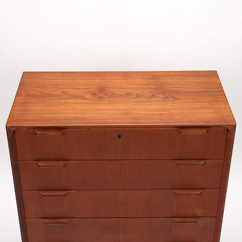 Mid-Century Deense ladekast van hoge kwaliteit. De vintage kast heeft een 6-tal lades en is uitgevoerd in teakhout met prachtige greepjes. Het ontwerp wordt toegeschreven aan Johannes Andersen. De bijzondere rondingen op de hoeken verdienen het te worden genoemd. De conditie is goed, enkel zeer minimale gebruikssporen, zie details. De afmetingen zijn 84,5 cm breed, 42 cm diep en 118 cm hoog.