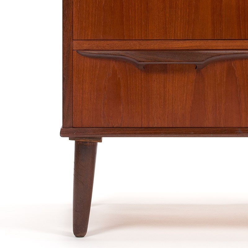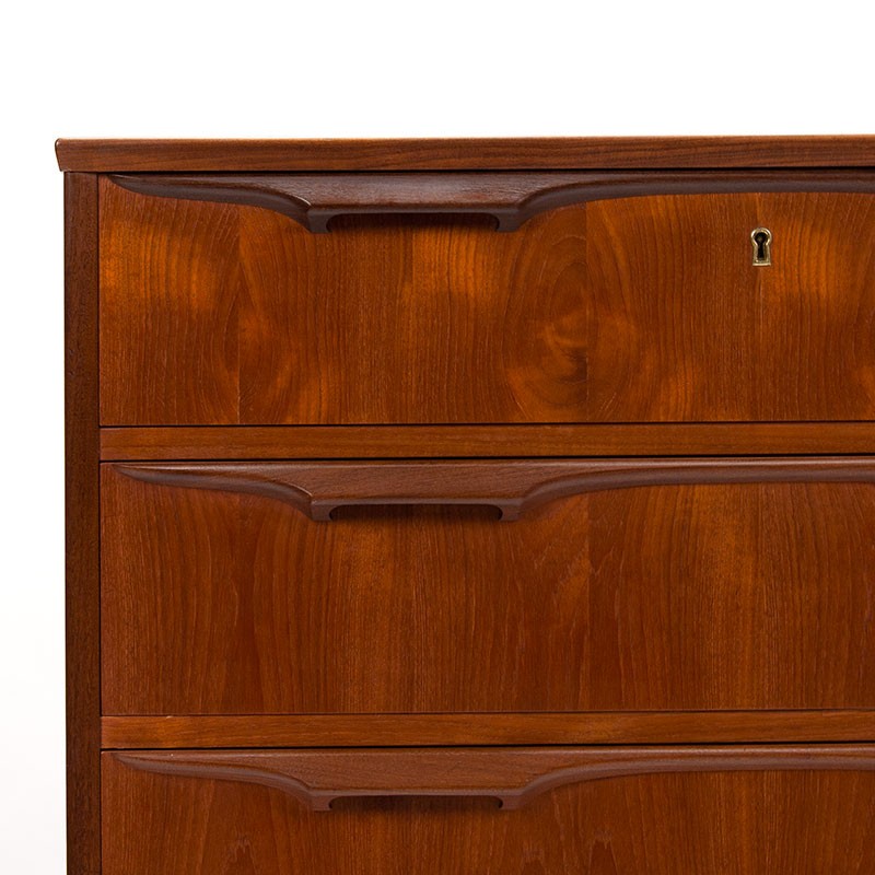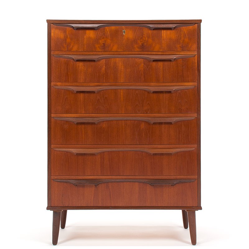 Design ladekast van de ontwerper Klaus Okholm voor Trekanten, Denemarken. De Mid-Century ladekast is een groot, luxe, vintage model uit de jaren zestig, uitgevoerd in hoge kwaliteit. Mooie details zijn aanwezig zoals de iets schuin staande pootjes en de organisch vormgegeven handgrepen aan de lades. De conditie is goed, zie details. De afmetingen zijn 81,5 cm breed, 44 cm diep en 121,5 cm hoog.