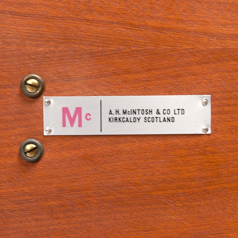 Schotse design kast uit de periode 1960-1969, van het merk McIntosh. Model Dundas, ontworpen door Tom Robertson. De vintage kast is uitgevoerd in teakhout en heeft zowel openslaande deurtje als lades, waarvan links een besteklade. Veel opbergruimte aanwezig. De conditie is goed, enkel lichte gebruikssporen passend bij de leeftijd, zie details. De afmetingen zijn 112 cm breed, 45,5 cm diep en 129 cm hoog.