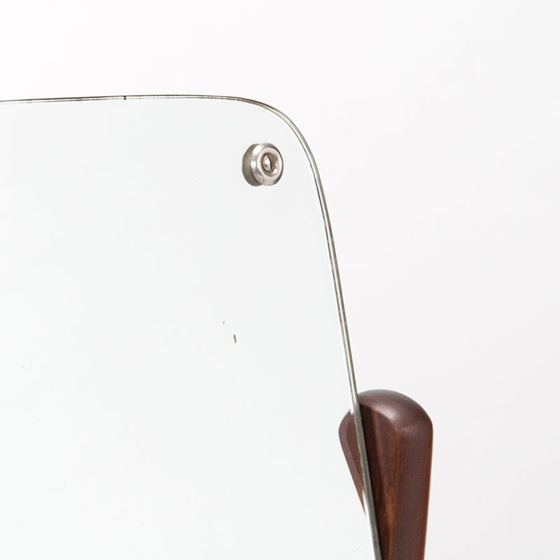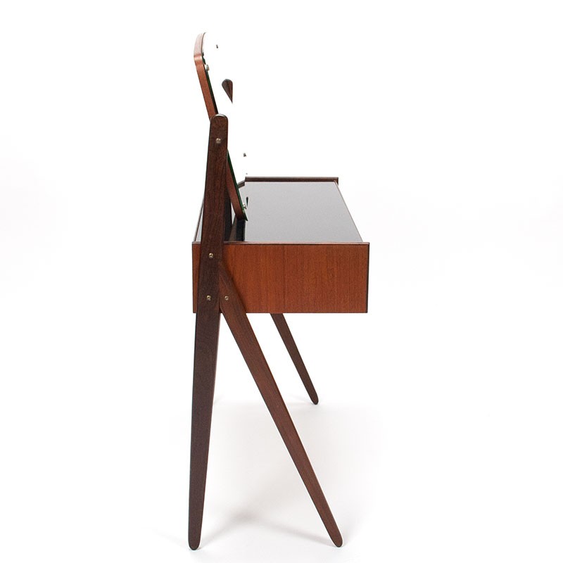 Kaptafel, Mid-Century vintage model, uit de eind vijftiger begin zestiger jaren. Het ontwerp is van Arne Vodder. Mooie donker teakhotuen uitvoering met zwart glazen boevenzijde en grote kantelbare spiegel. De conditie is goed gezien de leeftijd, minimale gebruikssporen, zie details. De afmetingen zijn 80,5 cm breed, 36 cm diep en 107 cm hoog ( 67 cm ex. spiegel).