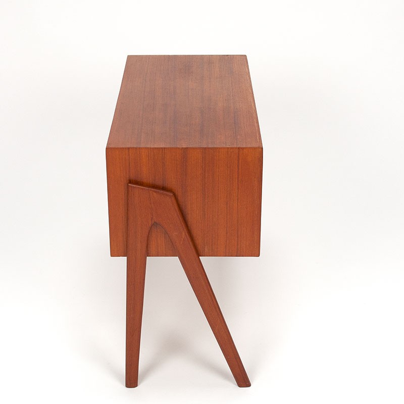 Design ladekastje, Mid-Century model uit de midden jaren zestig. Ontworpen door Andreas Pedersen voor A.P. Møbler Svenstrup. Het vintage kastje heeft 2 lades en een bijzonder vormgegeven onderstel. De conditie is goed, geen kringen, zie details. De afmetingen zijn 64 cm breed, 30 cm diep en 54 cm hoog.