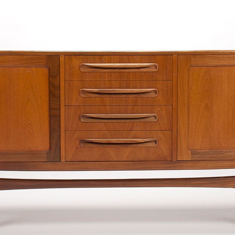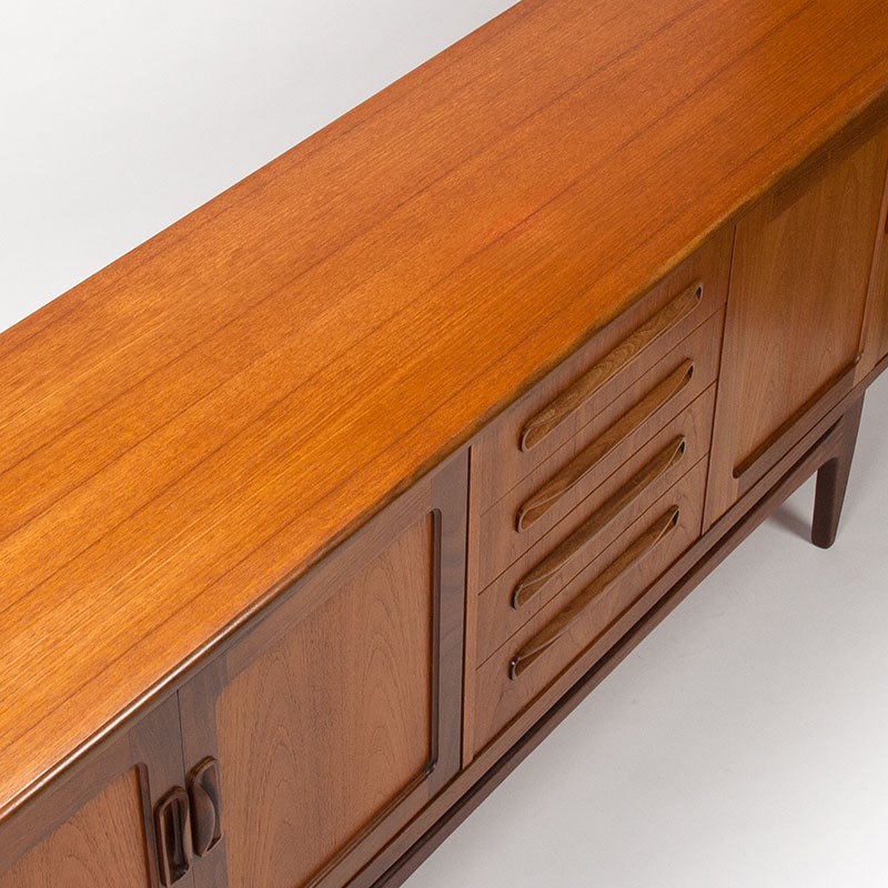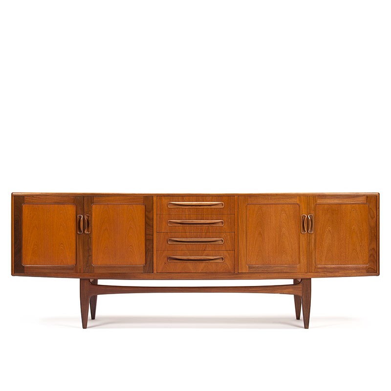Groot Modern Mid-Century design dressoir uit de jaren zestig. Het vintage dressoir is ontworpen door Victor Wilkins als onderdeel van de Fresco serie voor de Engelse meubelfabriek Gplan. Mooi symmetrisch vormgegeven met in het midden een ladeblok en aan weerszijden openslaande deurtjes, op een open onderstel. De conditie is goed, enkel zeer minimale gebruikssporen, zie details. De afmetingen zijn 213,5 cm lang, 45,5 cm diep en 79,5 cm hoog.
