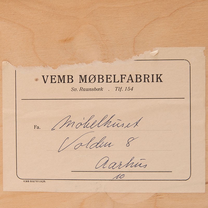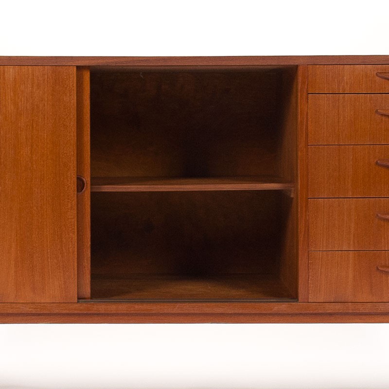 Dressoir in teakhout, kort model, uit de periode 1960-1969, Denemarken. Mooi vintage Mid-Century Modern dressoir uit de Vemb Møbelfabrik ( gemerkt). De kast heeft links 2 schuifdeuren met planken, rechts zijn een 5 tal lades aanwezig met mooi vormgegeven handgrepen. De conditie is goed, geen kringen, aan de linkerzijde zijn onder 2 kleine iets donkerdere stukjes hout zichtbaar, zie details. De afmetingen zijn 149,5 cm lang, 43 cm diep en 84 cm hoog.