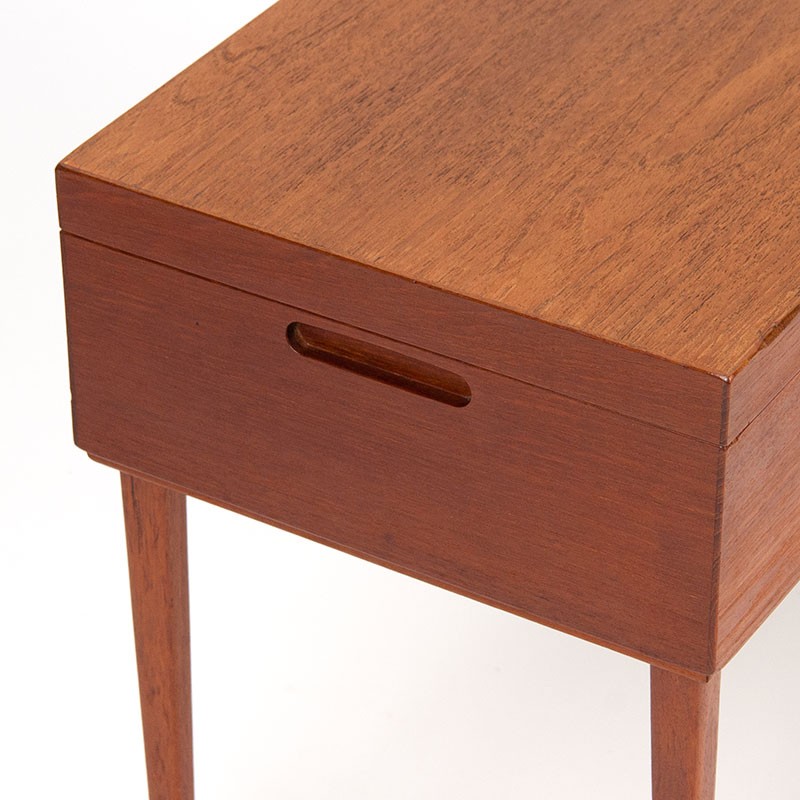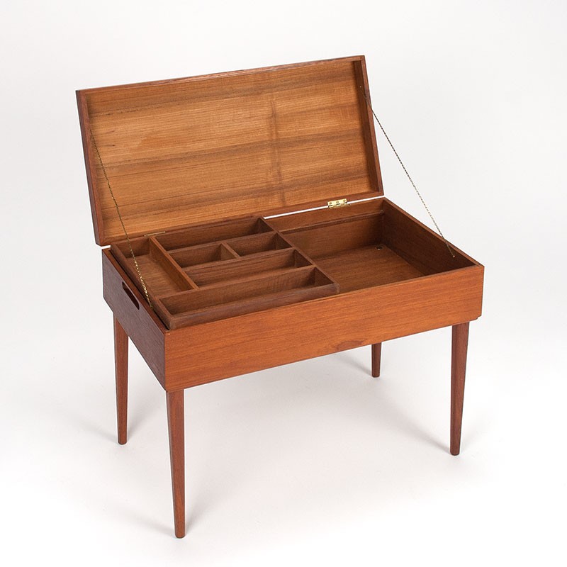 Deens teakhouten naaigerei kastje. Klein vintage model op hoge, slanke pootjes. Uitneembaar compartiment. De conditie is goed gezien de leeftijd, zie details. De afmetingen zijn 55 cm breed, 30 cm diep en 44,5 cm hoog.