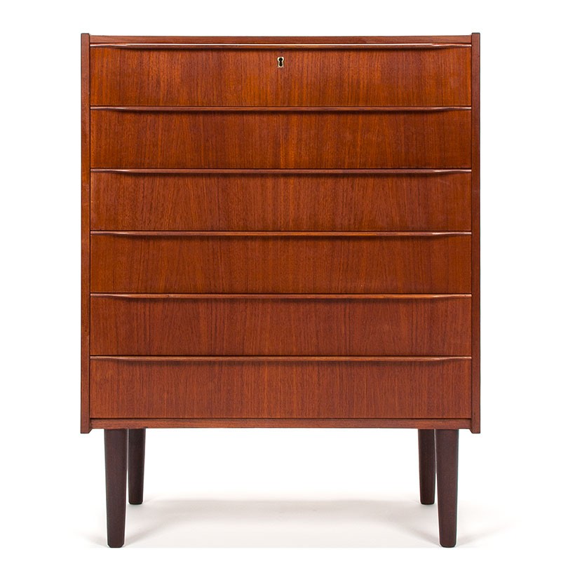 Ladekast uit de midden jaren zestig, Denemarken. Mooi strak ontworpen model met lange greepjes aan de 6-tal lades. Vintage model, uitgevoerd in teak. De conditie is redelijk goed, een lichte geur is aanwezig in de kast hier is de prijs op aangepast. De afmetingen zijn 76 cm breed, 41,5 cm diep en 100,5 cm hoog.