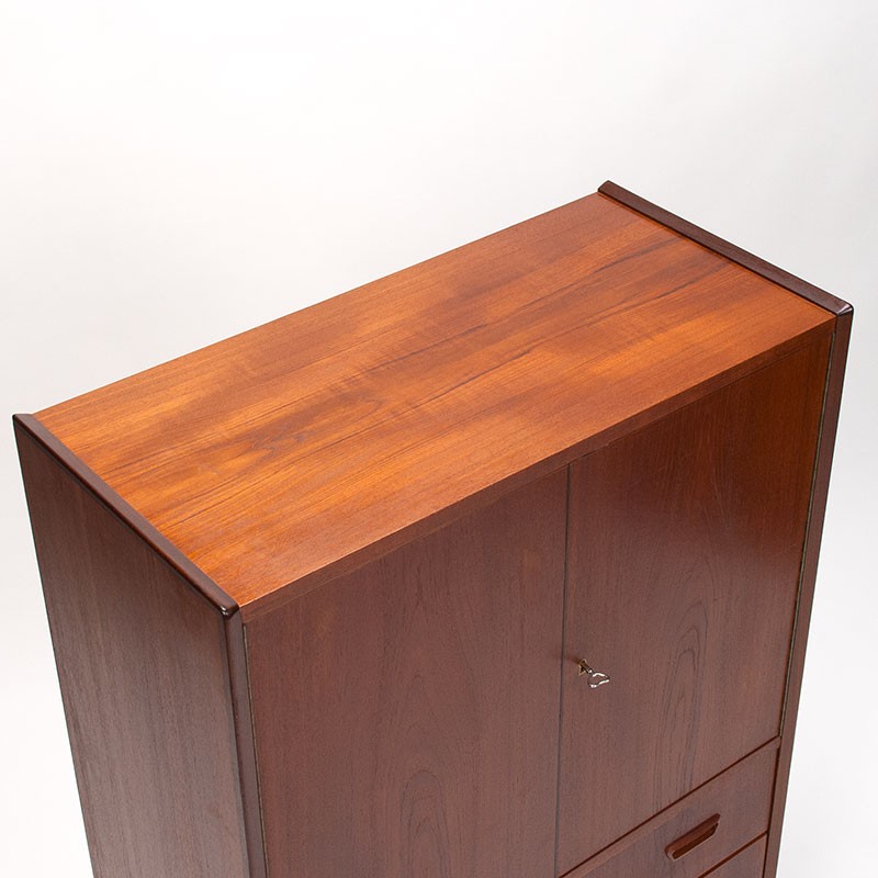 Deense kast in teakhouten uitvoering, afkomstig uit de periode 1960-1969. De vintage kast heeft 2 openslaande deuren met losse, in hoogte verstelbare planken. Daaronder 2 ruime lades. De conditie is goed, zeer lichte gebruikssporen aan de bovenzijde ( zeer oppervlakkige krasjes, geen kringen), zie details. De afmetingen zijn 80 cm breed, 38,5 cm diep en 120 cm hoog.
