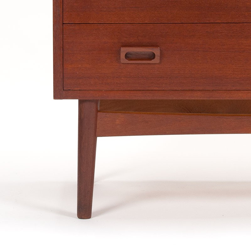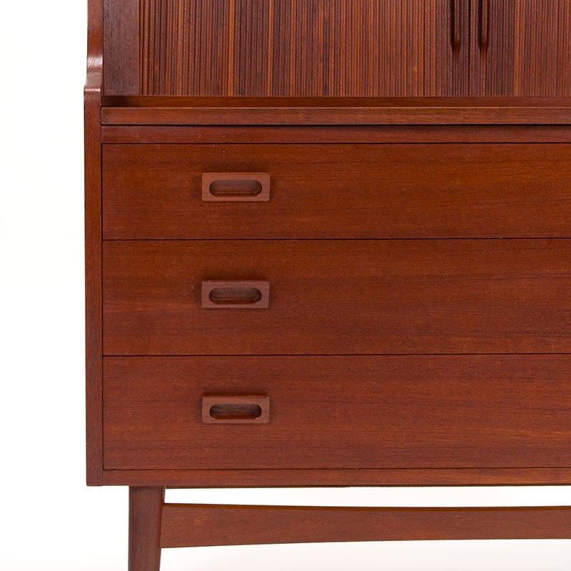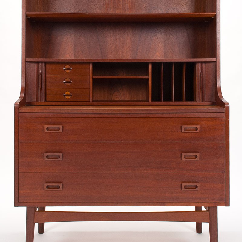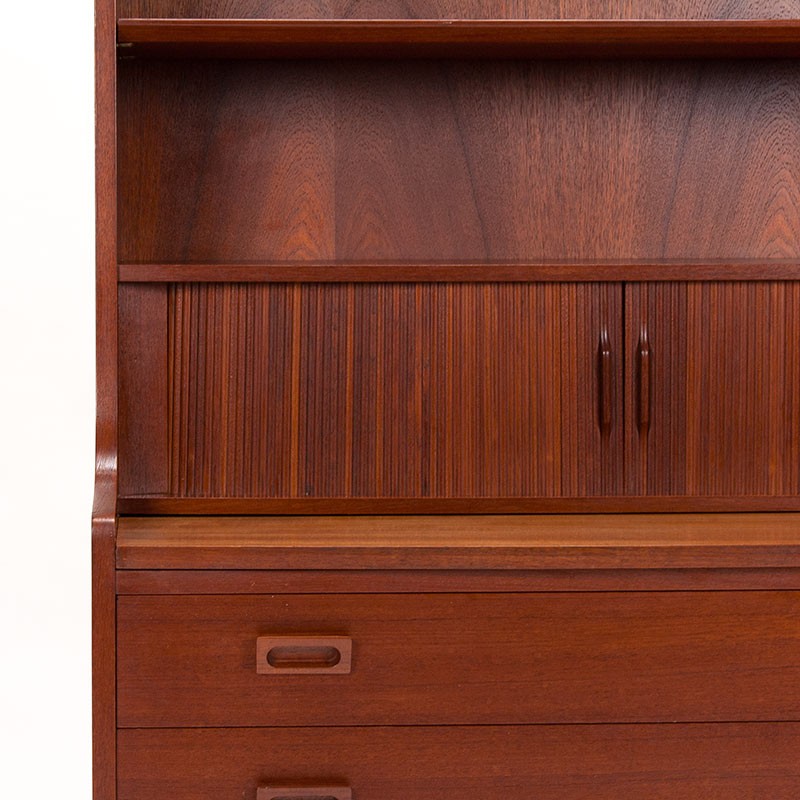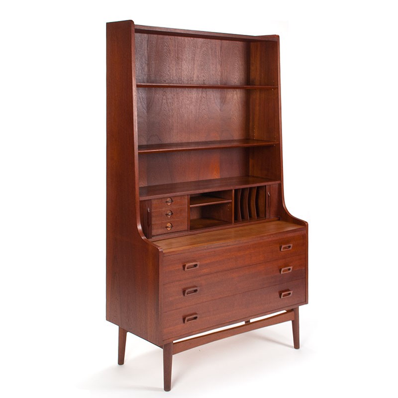 Moderne Mid-Century Deense design boekenkast en secretairemeubel in een ontwerp. De vintage kast is ontworpen door Johannes Sorth en gemaakt in de Nexø Møbelfabrik Bronholm. Door de lades aan de onderzijde van de kast is er veel opbergruimte aanwezig. Het werkblad is aanwezig op een hoogte van 71,5 cm en is uitschuifbaar. De conditie is goed, zie de details. De afmetingen zijn 100 cm breed, 21 tot 42,5 cm diep en 182 cm hoog.