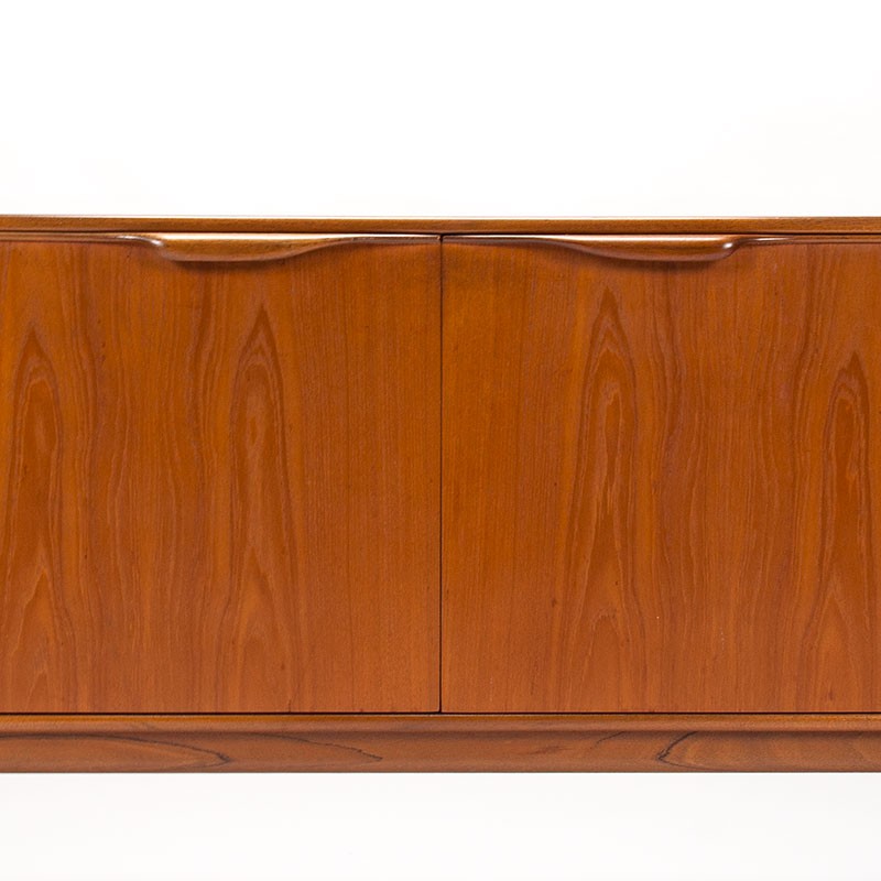 Mcintosh dressoir, type Dunvegan, uit de zestiger jaren. Prachtig vintage Schotse Mid-Century dressoir met mooie organisch vormgegeven handgrepen en veel opbergruimte. Deels ontworpen als buffet en barkast. De conditie is goed, zie de details. De afmetingen zijn 201,5 cm lang, 45 cm diep en 75 cm hoog.