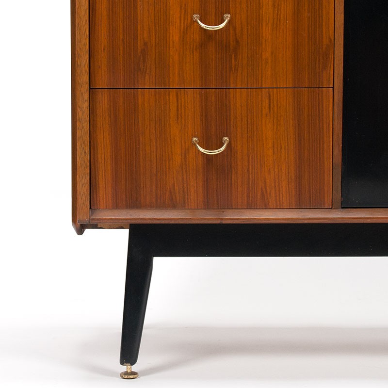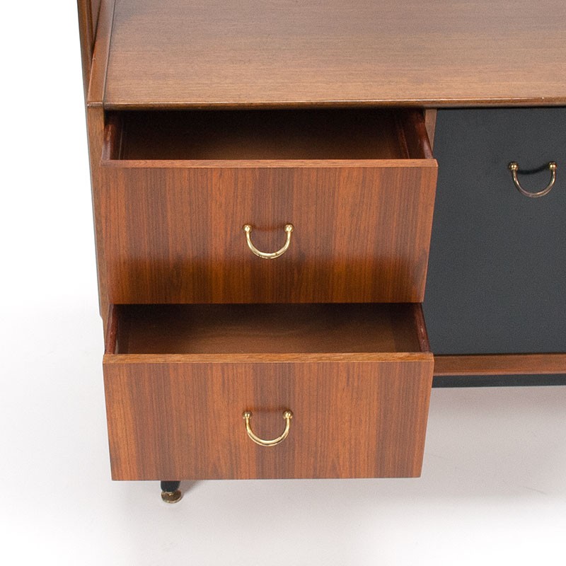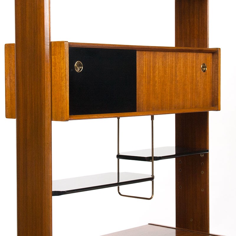 Mid-Century design room divider van het Engelse merk Gplan, model Librenza. Afkomstig uit de eind vijftiger, begin zestiger jaren. Prachtig meubel met speelse indeling dat dwars op de muur geplaatst zou kunnen worden doordat de achterzijde ook afgewerkt is. Greepjes zijn messing. De conditie is goed, enkel minimale gebruikssporen, zie details. De afmetingen zijn 95 cm breed, 47 cm diep en 191 cm hoog.