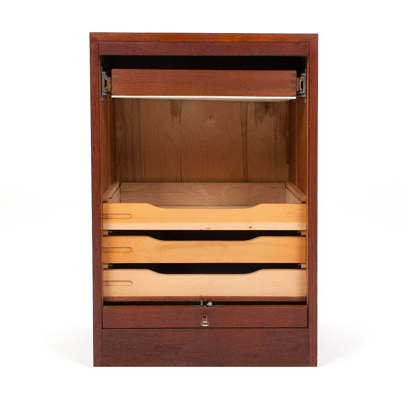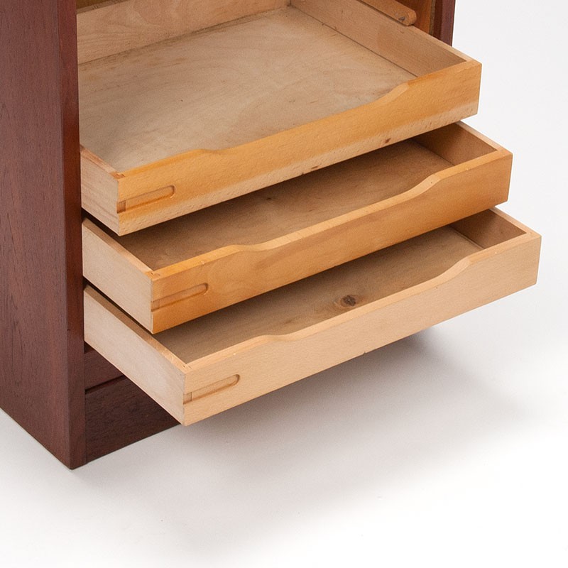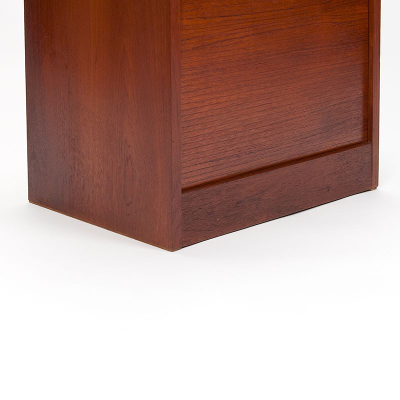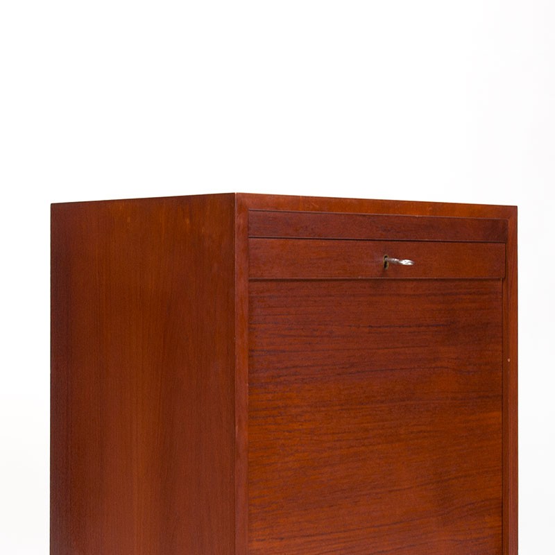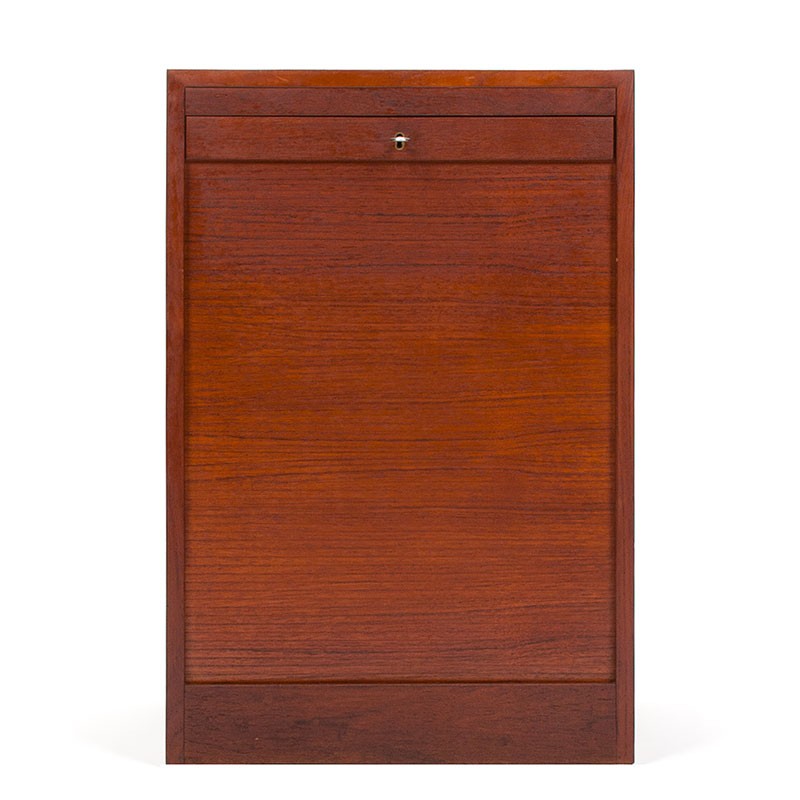 Deens archiefkastje van de meubelfabrikant Vifa. Periode 1955-1965. Mooi vintage exemplaar met roldeurtje in teakhouten uitvoering. De conditie is goed, enkel zeer lichte gebruikssporen, zie details. De afmetingen zijn 50 cm breed, 37,5 cm diep en 76 cm hoog.