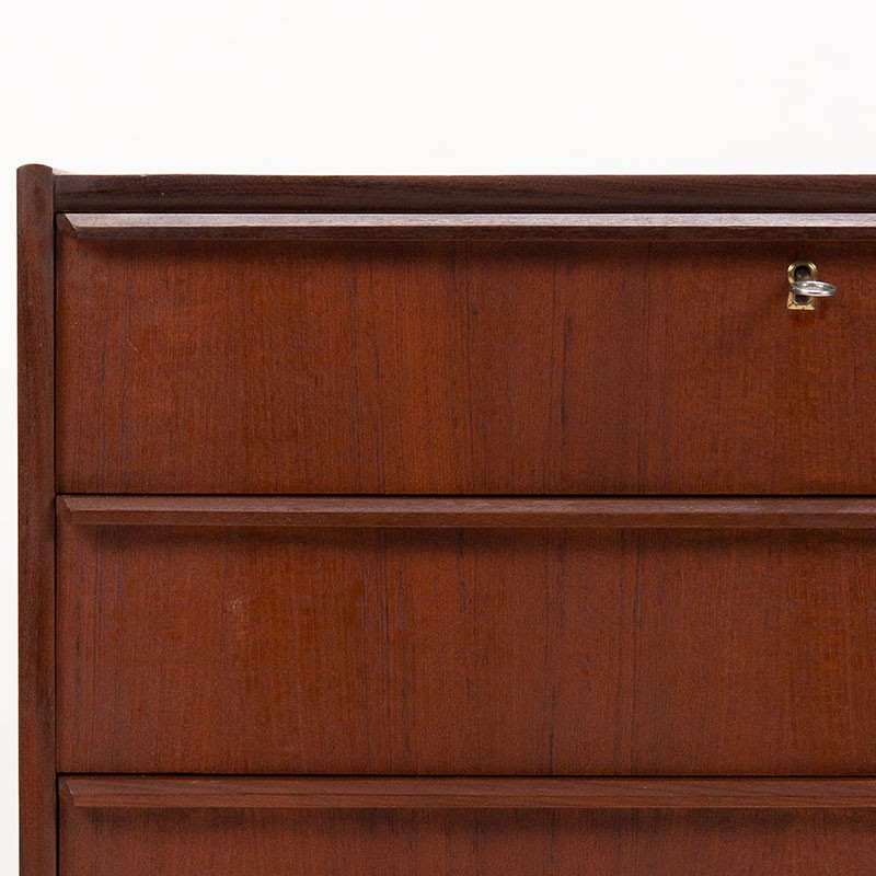 Teakhouten ladekast met 4 lades. Afkomstig uit de periode 1960-1969, Denemarken. Mooi strak vormgegeven model op slanke, ronde pootjes. De conditie is goed gezien de leeftijd, geen kringen of krassen. De afmetingen zijn 69,5 cm breed, 40 cm diep en 75,5 cm hoog.