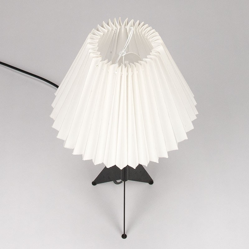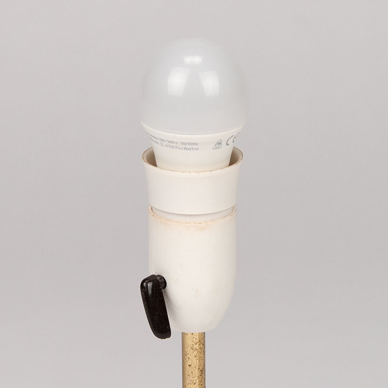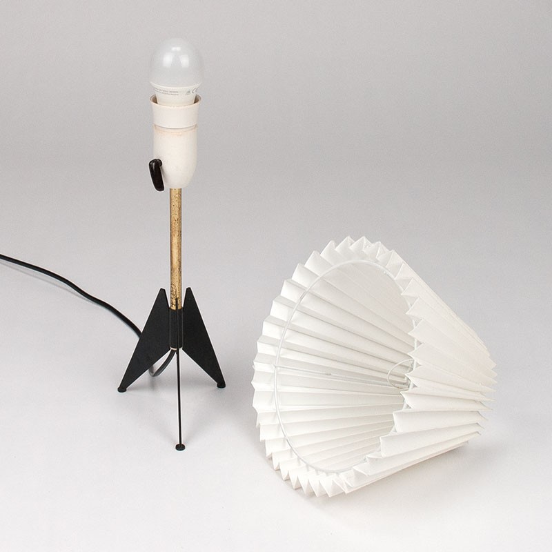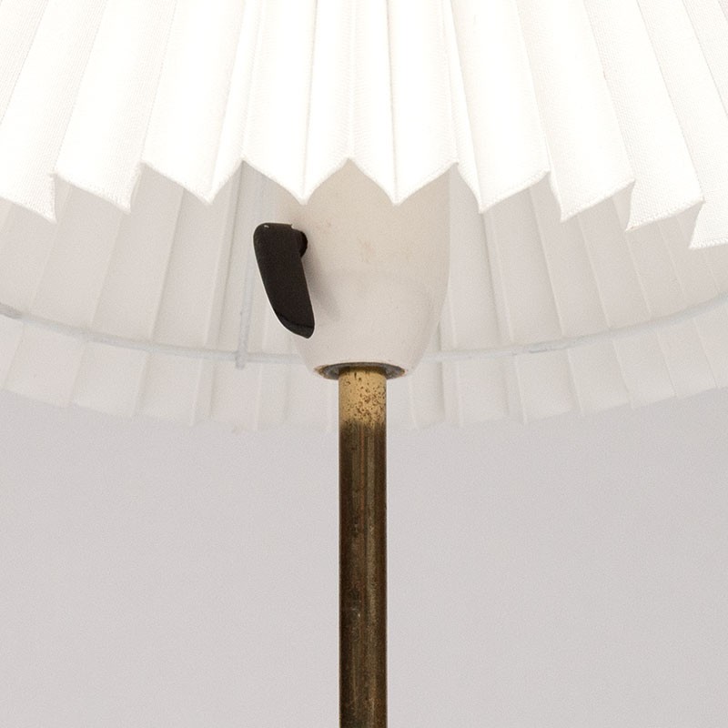 Vintage tafellamp uit de periode 1950-1959, Denemarken. Mooi vormgegeven voet in zwart metaal, gecombineerd met messing. De kap is een plissé kapje dat klemt op de gloeilamp. De conditie is goed gezien de leeftijd, op het messing zijn wat gebruikssporen zichtbaar. De afmetingen zijn 37,5 cm hoog, de diameter van de kap is 21 cm, de voet is 11 cm in diameter.
