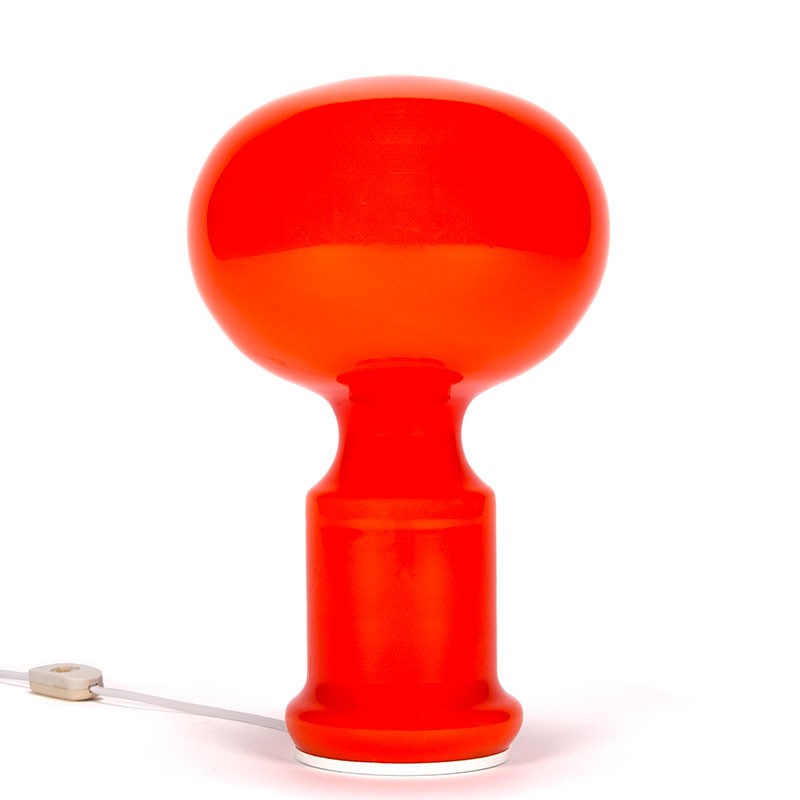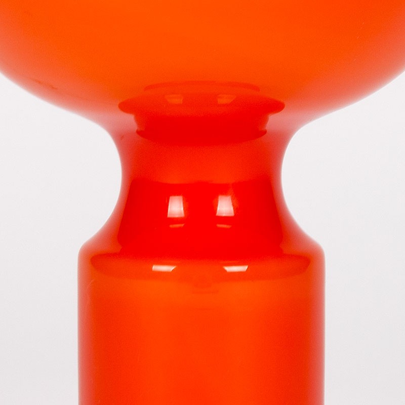 Glazen vintage tafellamp uit de zestiger jaren. Prachtige diepe oranje kleur, die warm en sfeervol licht geeft. Zeer waarschijnlijk afkomstig uit Italië. De conditie is goed, onbeschadigd ( bedrading is vervangen), zie details. De afmetingen zijn 35 cm hoog, de diameter is 20 cm op het breedste punt en 12 cm gemeten bij de voet.