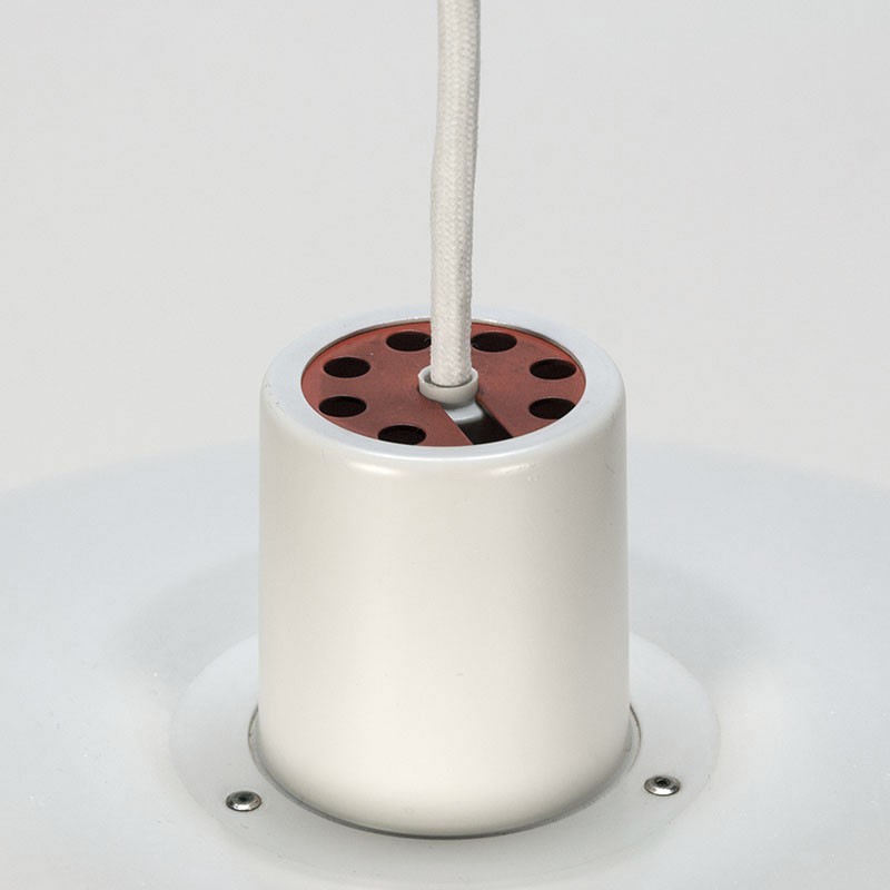 Vintage PH 4/3 hanglamp, ontworpen in 1958 door de Deense ontwerper Poul Henningsen en uitgebracht door Louis Poulsen. Orginele klassieker uit de Mid-Century periode. De kleur is wit en het hart van de lamp is oranje. Exemplaar uit de periode 1960-1969, zonder diffusser. De conditie is goed, geen deukjes of krassen, zie details. De afmetingen zijn 40 cm in diameter en 20 cm hoog.