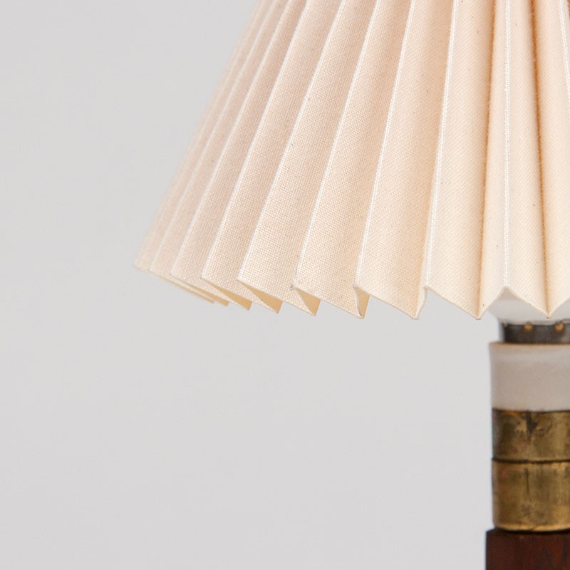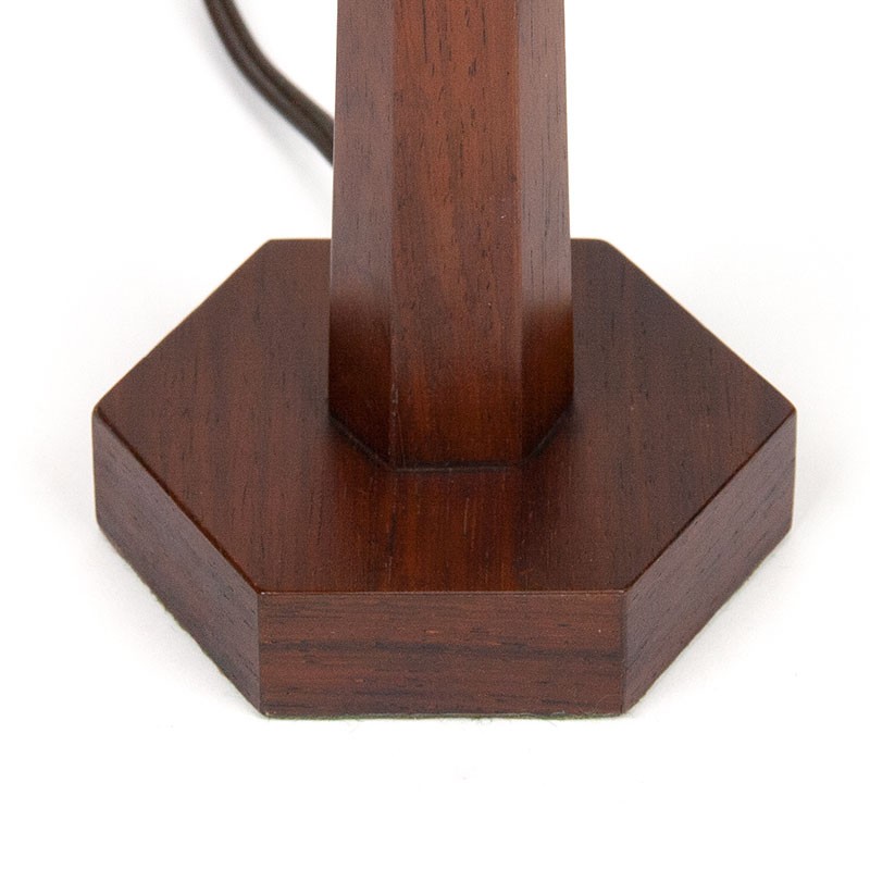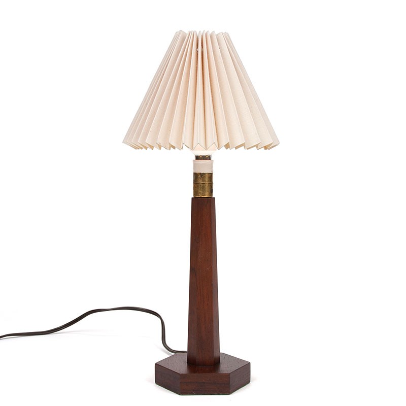 Mid-Century design tafellampje uit de veertiger/ vijftiger jaren in strakke vormgeving/ art deco stijl. Mooie luxe uitvoering in palissanderhout met een messing/ porseleinen fitting. Los plissé klem kapje. De conditie is goed, zie details. De afmetingen zijn 35 cm hoog, kapje 16 cm in diameter, voet 8,5 cm.