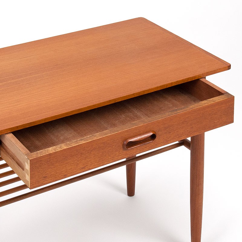 Deense bijzettafel met kleine lade en onderblad. Mooi vintage model uit de periode 1960-1969. Als bijzettafel, gangkastje maar ook als nachtkastje goed te gebruiken. De conditie is goed, zie details. De afmetingen zijn 63,5 cm breed, 38 cm diep en 54 xm hoog.