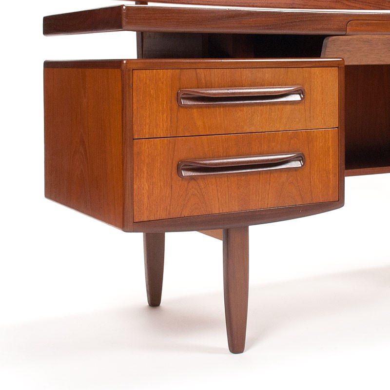 Gplan Mid-Century kaptafel, onderdeel van de Fresco serie ontworpen door Victor Wilkins. Mooi solide meubel, uitgevoerd in teakhout, met een blad dat lijkt te zweven boven de lade blokken. Afkosmtig uit de eind zestiger, begin zeventiger jaren. Kan ook eenvoudig als bureau gebruikt worden door de spiegel los te halen. De conditie is goed, enkel lichte gebruikssporen, zie de details. De afmetingen zijn 152,5 cm lang, 45,5 cm diep en 70 cm hoog exclusief de spiegel en 120 cm inclusief.