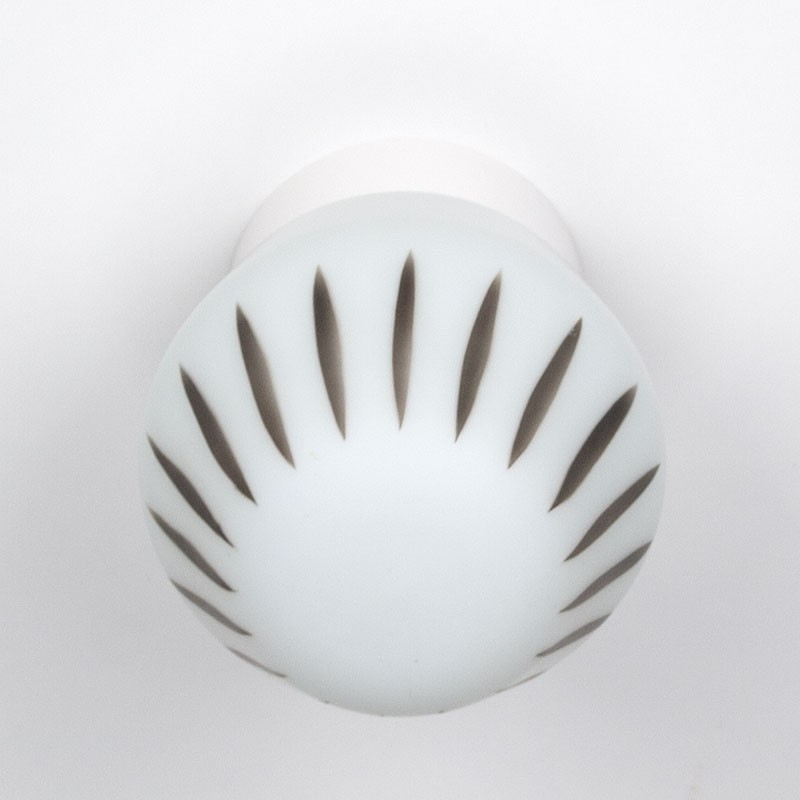Melkglazen plafonnière uit de periode 1950-1965. Mooi gedecoreerd. Vintage exemplaar met nieuwe plafondbevestiging. De conditie is goed, glas in goed staat. De afmetingen zijn 14 cm in diameter en 18,5 cm hoog.