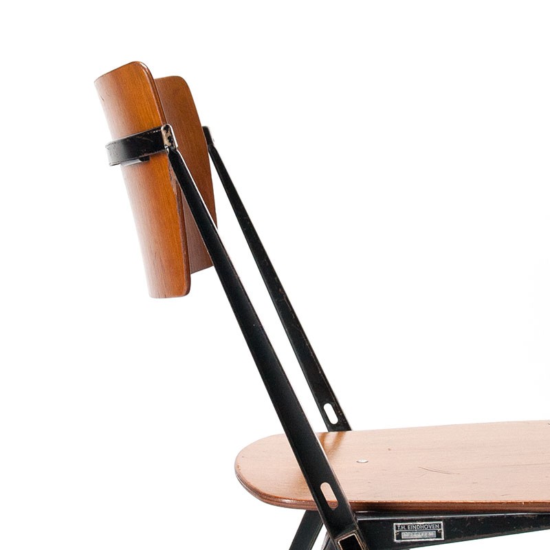 Pyramide stoel, Nederlandse vintage industriële design stoel. Ontwerp van Wim Rietveld in 1960 voor Ahrend de Cirkel. Bekroond met de Signe d’Or. Bijzondere industriële stoel met zwart metalen frame en houten zitting. Dit exemplaar heeft dienst gedaan op de T.H. Eindhoven, zie merkplaatje. De conditie is redelijk goed, het frame heeft duidelijke gebruikssporen en ook de zitting heeft wat gebruikssporen, zie de details. De afmetingen zijn 47 cm breed, 46,5 cm zithoogte en 79,5 cm hoog.