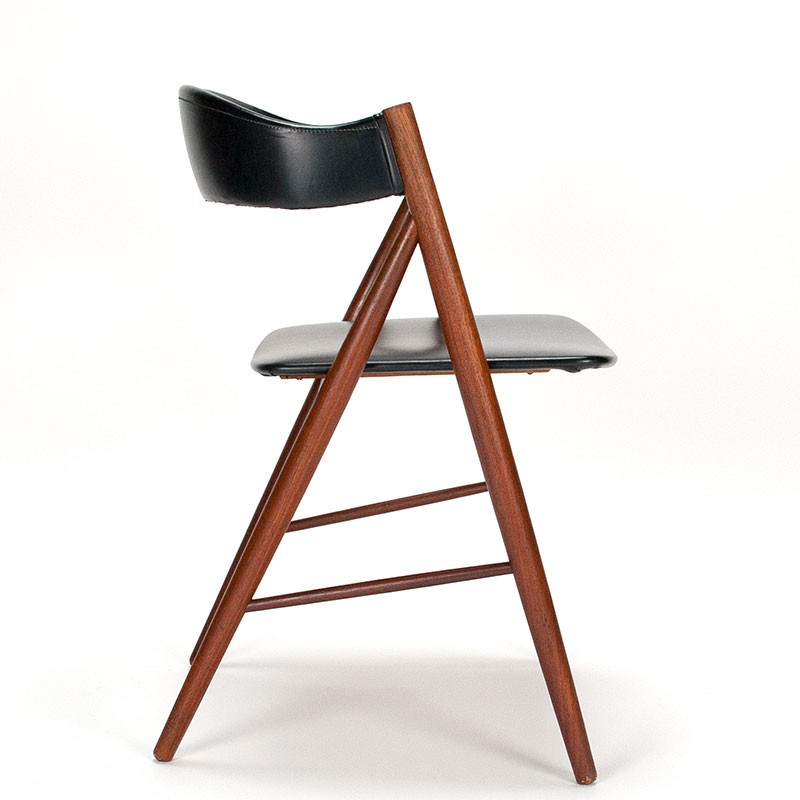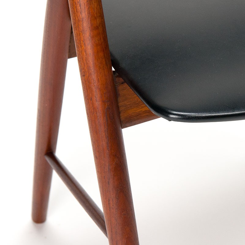 Deense vintage design stoel uit de begin zestiger jaren. Het model heeft een beklede ronde rugleuning in zwart skai. Het frame is van teak. Ontwerp is in de stijl van Kai Kristiansen en Henning Kjaernulf. De conditie is goed, bekleding is intact en origineel, zie details. De afmetingen zijn 49,5 cm breed, 44,5 cm zithoogte en 71 cm hoog.