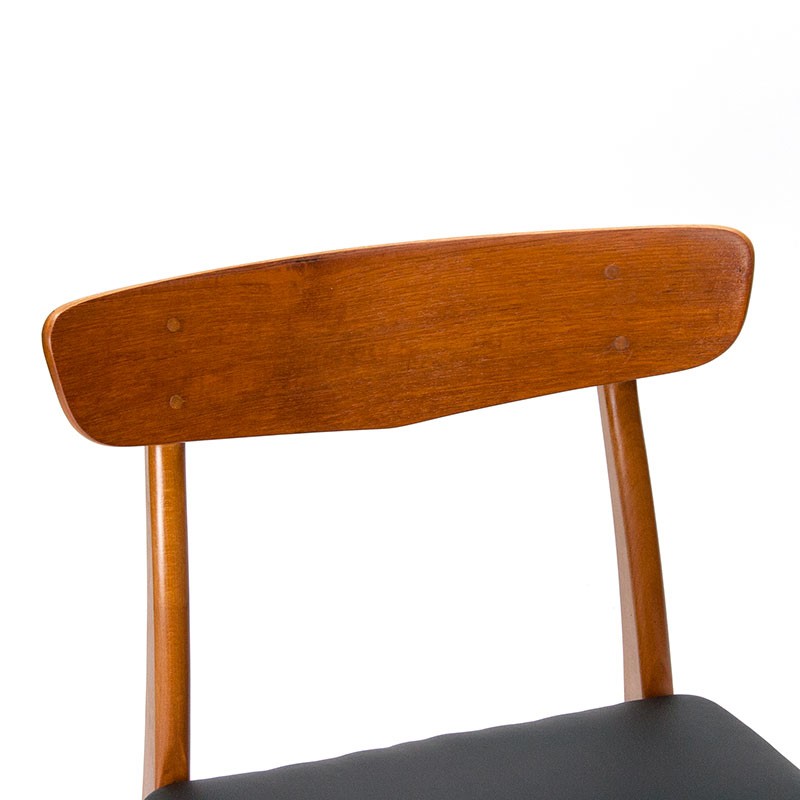 Eettafel stoel, vintage model, van de Deense meubelfabrikant Findahl. Afkomstig uit de periode 1965-1969. Mooi model met teakhouten rugleuning en beuken frame. De conditie is goed, minimale gebruikssporen en zwarte kunstleren zitting ( vernieuwd), zie details. De afmetingen zijn 46 cm breed, 46 cm zithoogte en 76,5 cm hoog.