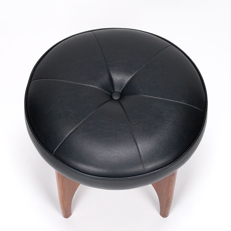 Engelse Mid-Century kruk met teakhouten frame en kunst-leren zitting. Mooi vormgegeven, ontworpen door Victor Wilkins als onderdeel van de Fresco serie voor Gplan. De conditie is goed, kunstleer is intact, zie details. De afmetingen zijn 51 cm in diameter en 44,5 cm hoog.