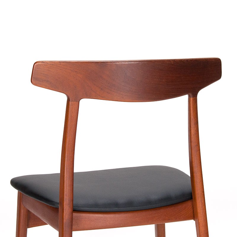 Deense design eettafel stoel ontworpen door Henning Kjaernulf voor Bruno Hansen. De stoel komt uit de vijftiger jaren en is uitgevoerd in teak. Gemerkt aan de onderzijde. De conditie is goed, zie details. De afmetingen zijn 49,5 cm breed, 45,5 cm zithoogte en 79 cm hoog.