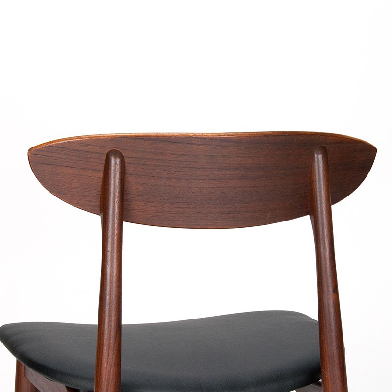 Deense eettafel stoel uit de Mid-Century periode. Vintage model uitgevoerd in teakhout met nieuwe kunstleren zitting. Mooi vormgegeven frame en rugleuning. De conditie is goed, zie details. De afmetingen zijn 50,5 cm breed, 46,5 cm zithoogte en 76,5 cm hoog.