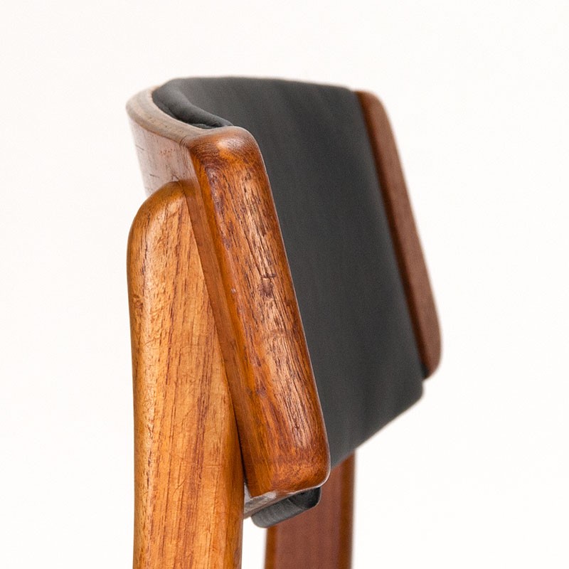 Set van 4 eettafel stoelen uit de midden jaren zestig, Denemarken. Mooie vintage set van teakhout met beklede rugleuning voor extra comfort. Bekleding is vervangen voor zwart kunstleer. De conditie is goed, enkel zeer minimale gebruikssporen, zie details. De afmetingen zijn 46 cm breed, 45,5 cm zithoogte en 78,5 cm hoog.