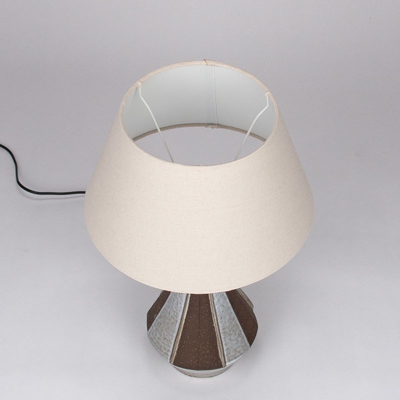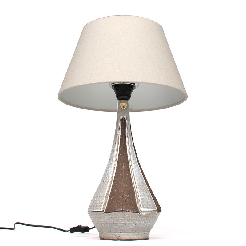 Deense design tafellamp van Michael Andersen & Son, model nummer 6342. Mooie aardewerken voet, gemerkt. De fitting is vervangen voor een nieuw exemplaar. De conditie is goed, bedrading vervangen, zie details. De afmetingen zijn 47 cm hoog, de voet is 31 cm hoog en 15,5 cm in diameter.