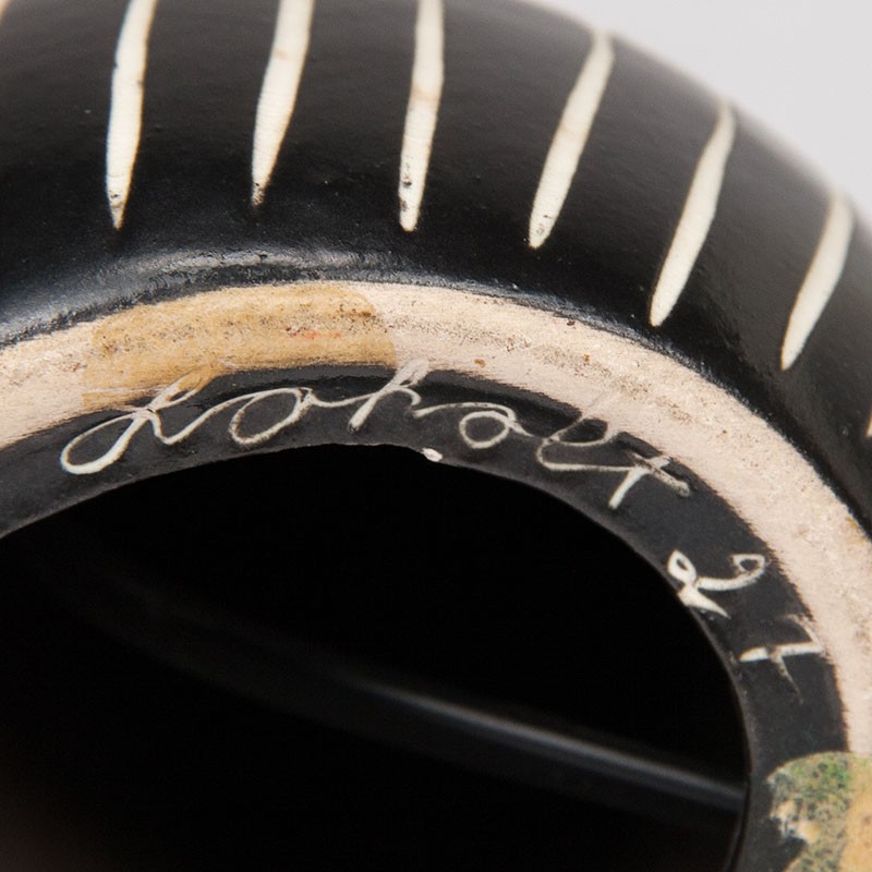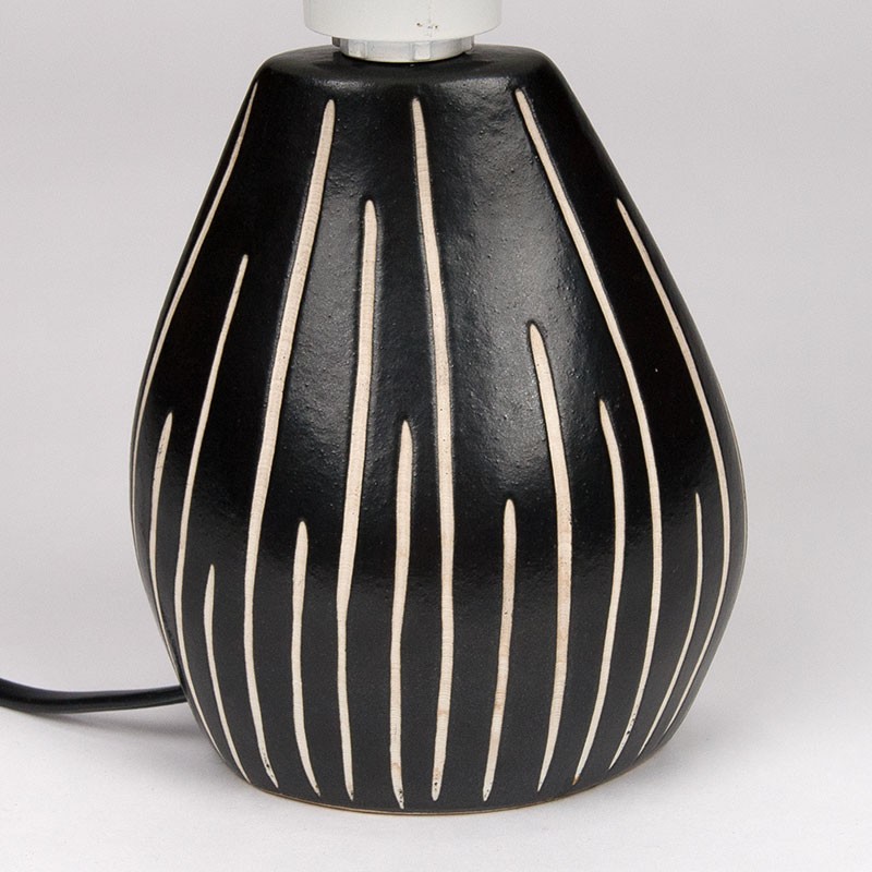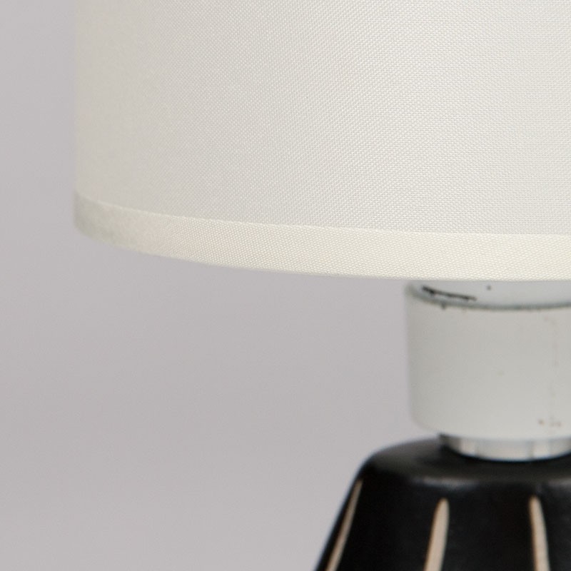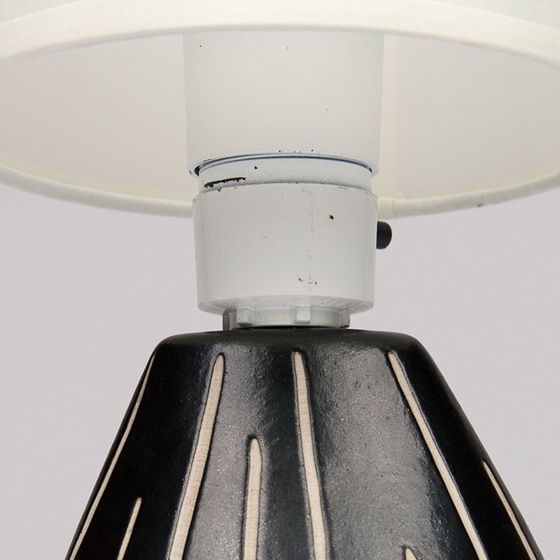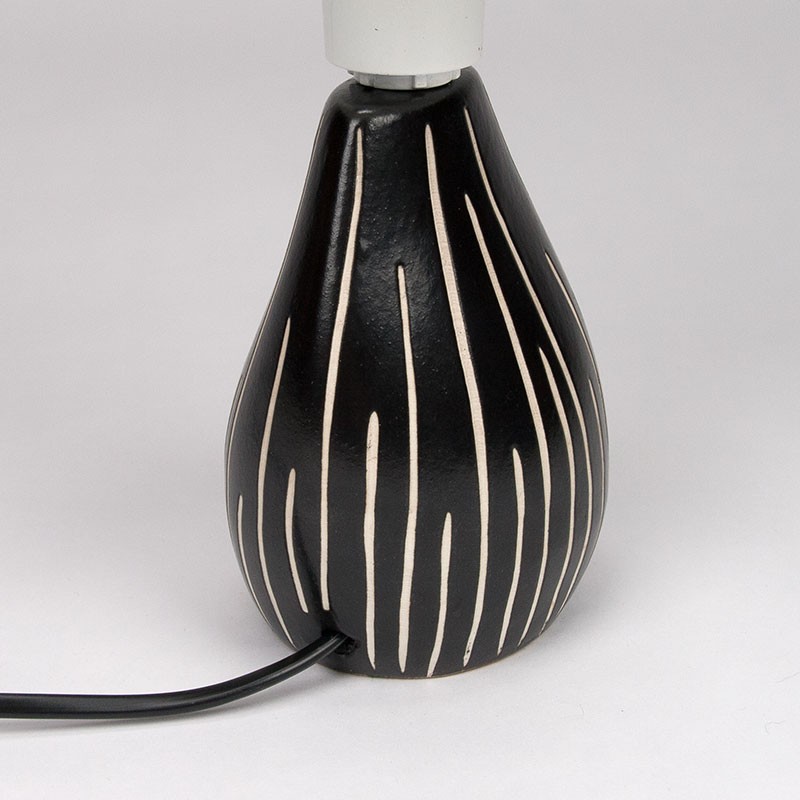 Mid-Century klein model tafellamp uit de eind vijftiger jaren. Gemaakt en ontworpen door Elisabeth Loholt met model nummer 27, in zwart en wit keramiek. De conditie is goed, onbeschadigd en opnieuw bedraad, zie details. De afmetingen zijn 30 cm hoog inclusief de kap, de voet is 13 cm hoog exclusief de fitting en 11 bij 8 cm.