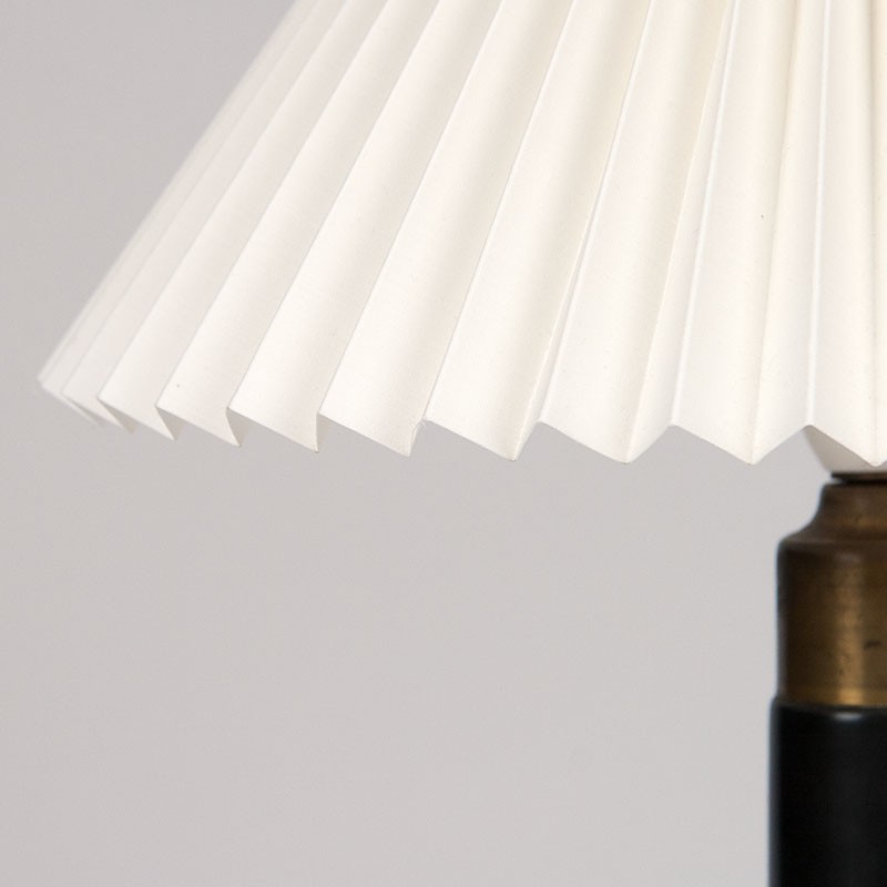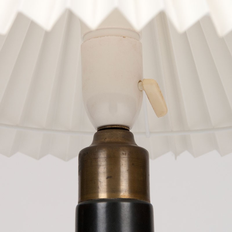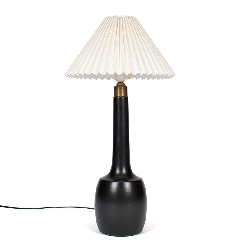 Deense design tafellamp, uitgevoerd in keramiek. De Mid-Century tafellamp is een ontwerp van Esben Klint en uitgebracht door Le Klint/ Palshus. Nummer 945. Bijzondere zwart matte voet met messing detail en klem- plisse kap. De conditie is goed, bedrading is vervangen, voet is onbeschadigd. De afmetingen zijn totaal 33 cm in diameter en 64 cm hoog, de voet los is 45 cm hoog, gemeten tot de fitting.