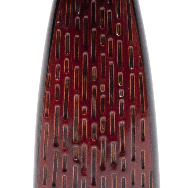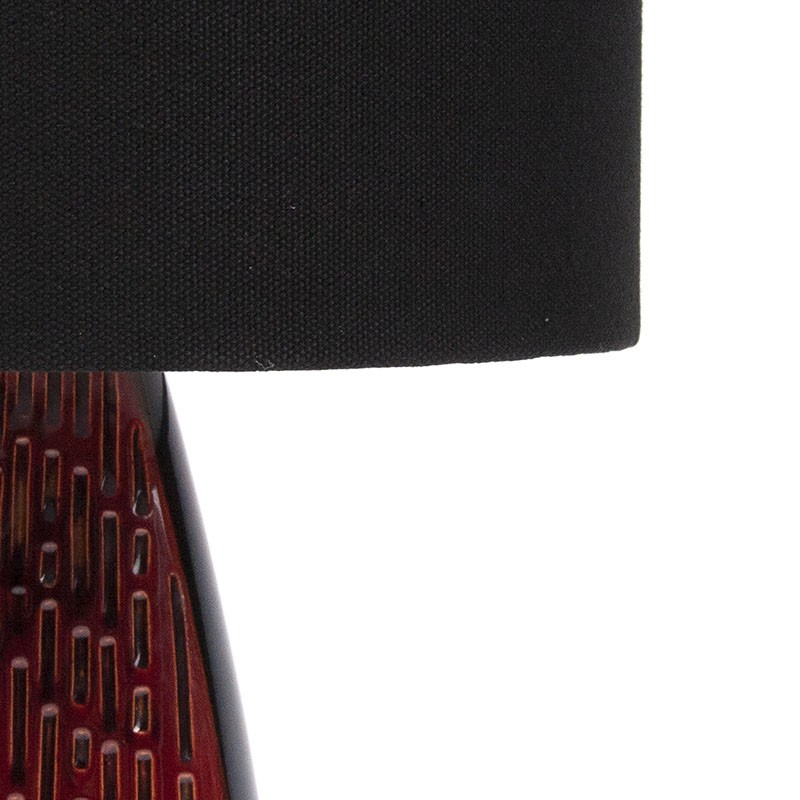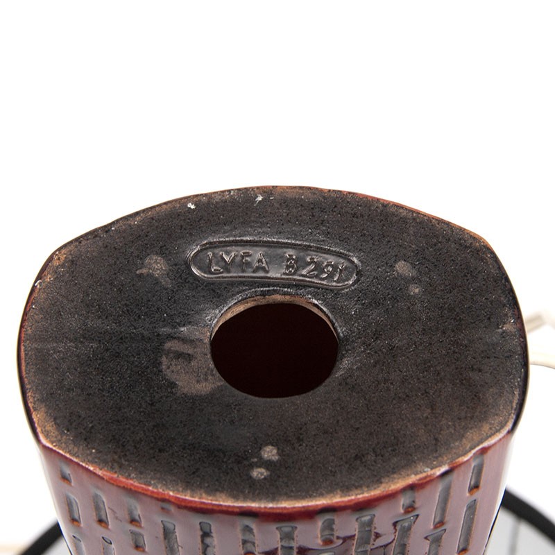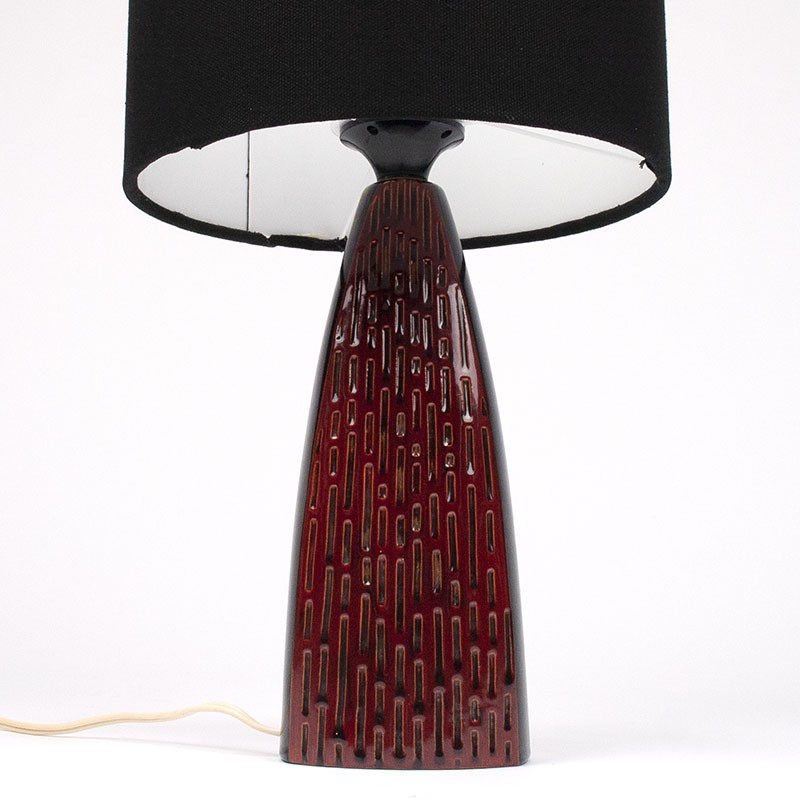 Deense vintage tafellamp uit de zestiger jaren. Prachtig uitgevoerd met voet van keramiek in zwart en bordeaux. De lamp is aan de onderzijde gemerkt Lyfa B291. De conditie is goed, bedrading is nagekeken, de kap is een nieuw exemplaar, zie details. De afmetingen zijn 42,5 cm hoog en 24 cm in diameter ( kap).