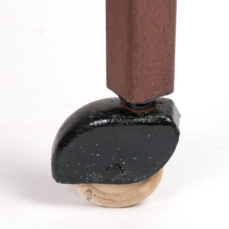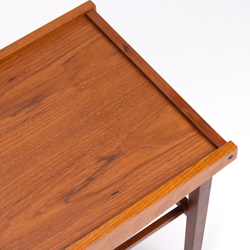 Serveerwagen/ theetrolley uit de periode 1965-1969, Denemarken. Bijzonder ontwerp, uitgevoerd in teakhout. Het geheel staat op wieltjes ( deze zijn zwart geschilderd, prijs is hierop aangepast). Het bovenstuk ligt los op het onderstel. De conditie is redelijk goed, geen kringen of krassen, zie details. De afmetingen zijn 69,5 cm lang, 45 cm breed en 52,5 cm hoog.