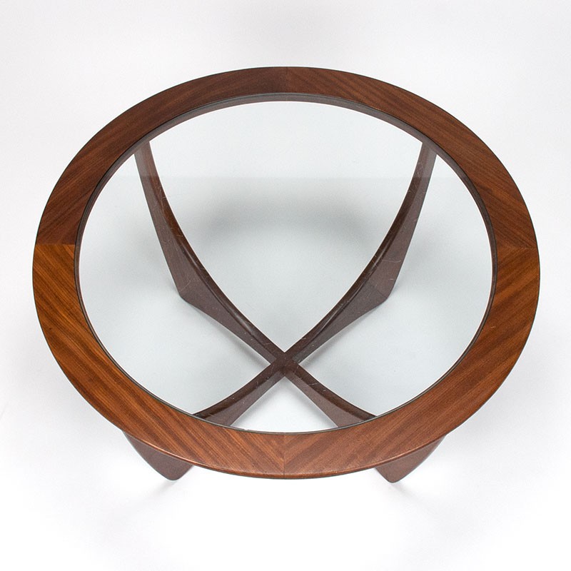 Engelse design salontafel ontworpen door Victor Wilkins voor Gplan. De vintage salontafel, model Astro, heeft een mooi open organisch ontwerp in teakhout en een glazen bovenzijde. De conditie is goed gezien de leeftijd, in het glas zijn enkele krasjes aanwezig. De afmetingen zijn 84 cm in diameter en 45,5 cm hoog.