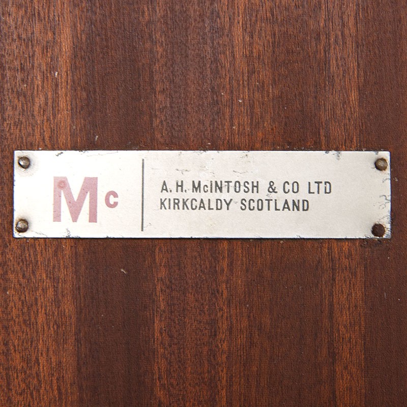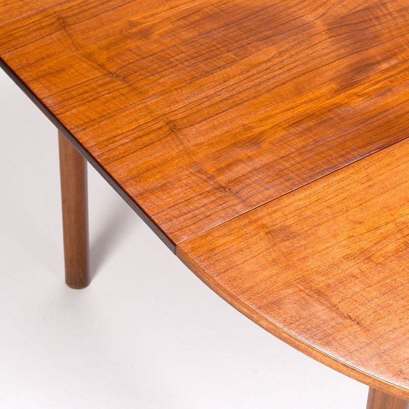 Mid-Century Schotse design eettafel. Deze vintage ronde eettafel is van het merk McIntosh. De uitschuifbare eettafel heeft het tussenblad verzonken liggen in de tafel. Mooi uitgevoerd in teakhout. De conditie is goed, enkel minimale gebruikssporen passend bij de leeftijd, zie details. De afmetingen zijn 122 cm in diameter, te vergroten met 45 cm, de hoogte is 74 cm.
