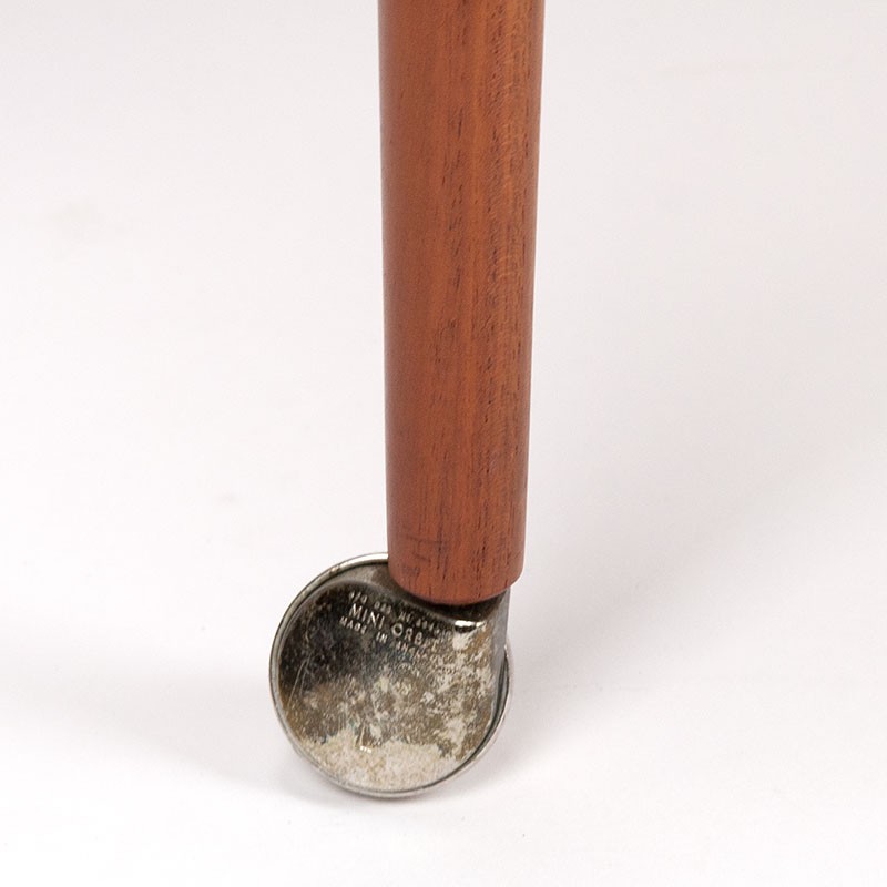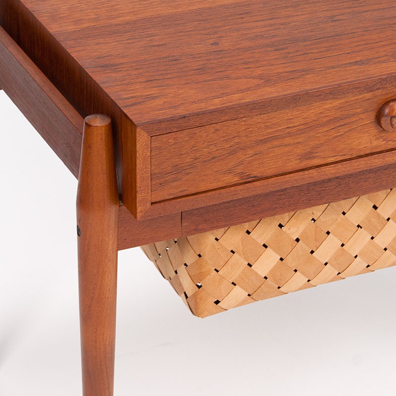 Deens vintage naaigerei tafeltje op wieltjes. Afkomstig uit de periode 1960-1969. Mooi model met gewoven rotan mand onder de lade, hier is een kleine restauratie zichtbaar. De conditie is goed gezien de leeftijd, enkele lichte gebruikssporen ( mand, en klein vlekje aan de bovenzijde, wieltjes), zie details. De afmetingen zijn 64 cm lang, 42 cm diep en 50,5 cm hoog.