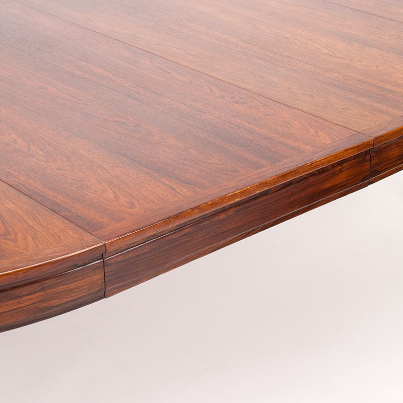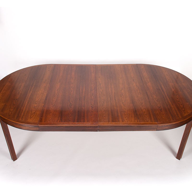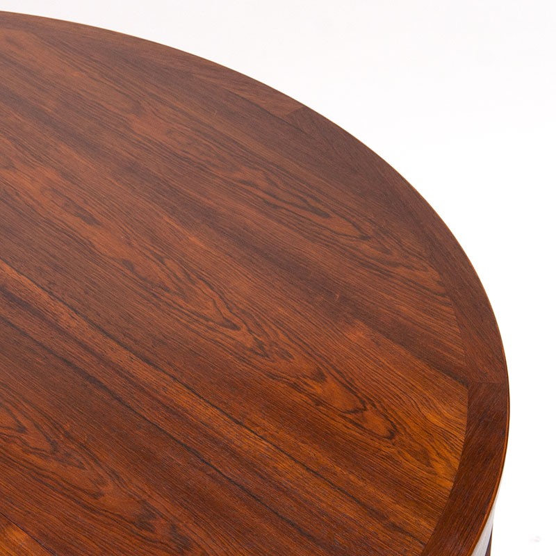Zweedse Mid-Century vintage design eettafel. Ontworpen door Bertil Fridhagen en uitgebracht door Bodafors in de eind zestiger jaren. De tafel is uitgevoerd in palissanderhout en heeft 2 tussenbanden. Zowel rond, met een of met 2 tussenbanden te gebruiken. De conditie is goed gezien de leeftijd, lichte gebruikssporen. De afmetingen zijn 120 cm in diameter, te vergroten met 2 maal 55 cm tot een maximale afmeting van 230 cm lengte, 73,5 cm hoog.