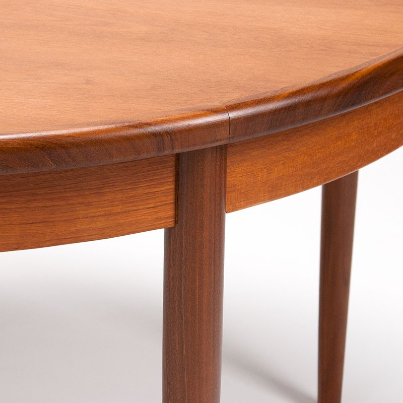 Ronde Mid-Century vintage eettafel uit de zestiger jaren. De design eettafel is ontworpen door Victor Wilkins. Afkomstig uit Engeland van het merk Gplan ( gemerkt). Mooie warme tint teakhout. De tafel is uitschuifbaar, het tussenblad ligt verzonken onder de tafel. De conditie is goed, enkel zeer minimale gebruikssporen, zie details. De afmetingen zijn 122 cm in diameter, te verlengen met 42 cm, de hoogte is 73 cm.