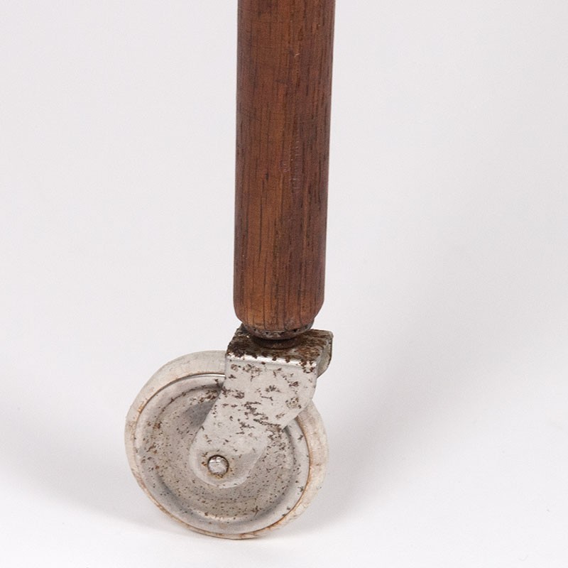 Deens bijzet/ naaigerei tafeltje uit d eind vijftiger jaren. Bijzonder vormgegeven op hoge pootjes met wieltjes. Het geheel heeft een lade met compartimenten en een rieten mand ( geheel intact). De conditie is goed, geen kringen oid, zie details. de afmetingen zijn 60,5 cm breed, 50,5 cm diep en 65,5 cm hoog.