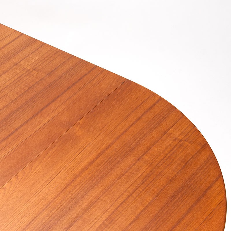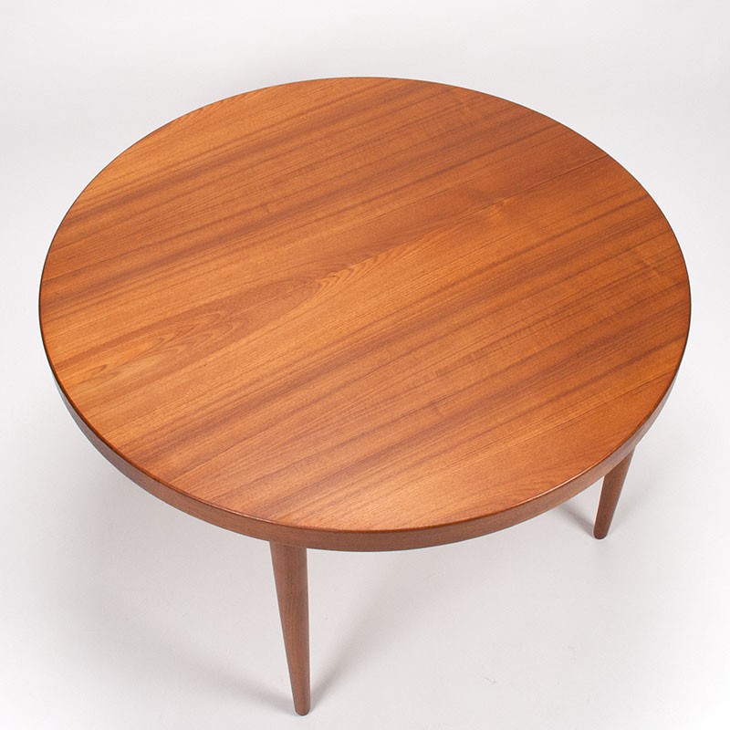 Deense Mid-Century vintage design eettafel in teakhout. Ontworpen door Kai Kristiansen voor Schou Andersen Møbelfabrik. De tafel is uitschuifbaar en heeft 2 extra tussenbanden, een met rand en een zonder de brede rand ( deze is echt bedoeld voor een etentje met tafelkleed). De conditie is goed, zie details. De afmetingen zijn 115 cm in diameter te vergroten met 2 maal 55 cm tot 225 cm lengte, 71 cm hoog.