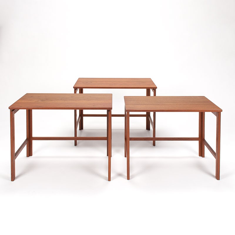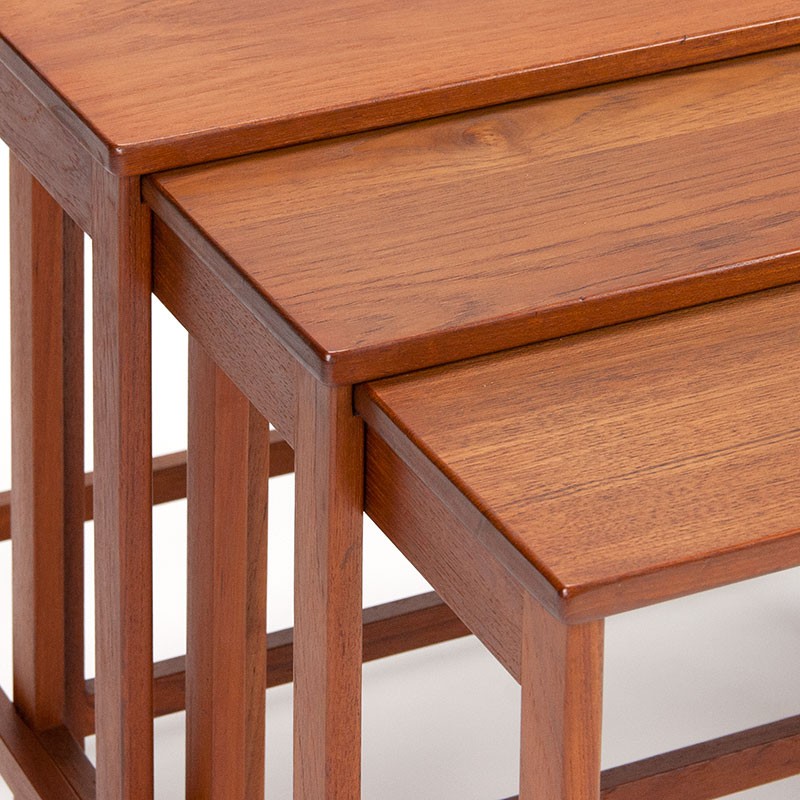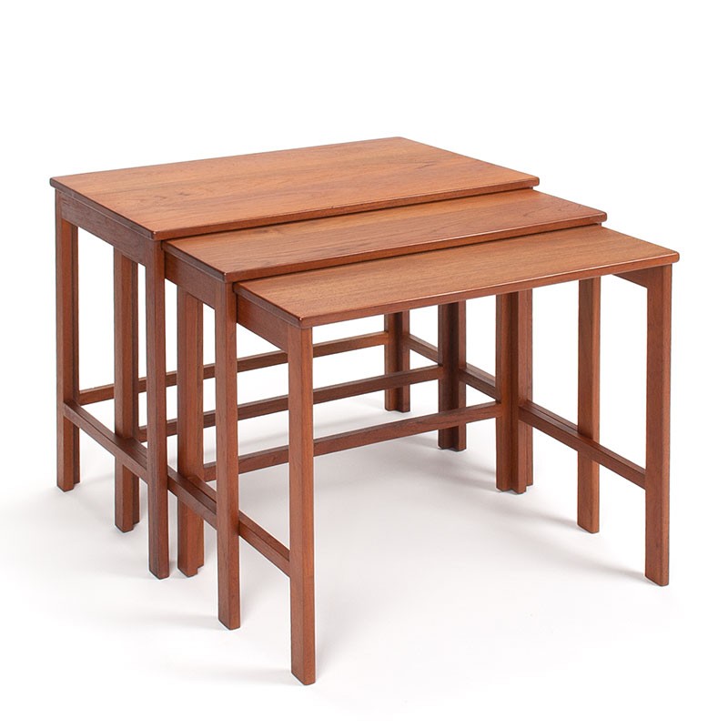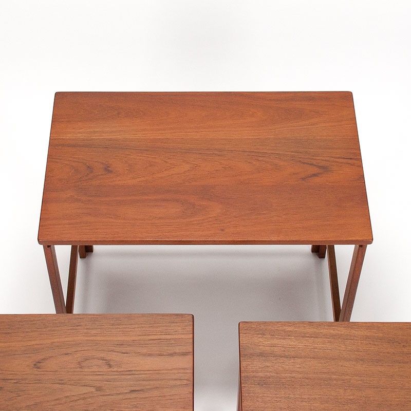 Design nesttafels ontworpen door Peter Hvidt & Ola Mølgaard-Nielsen voor France &Son. Stijlvolle vintage set in massief teakhouten uitvoering. De nesttafel hangen mooi onder elkaar en worden zo een geheel. De conditie is zeer goed gezien de leeftijd, geen kringen of krassen, zie details. De afmetingen zijn 60,5 cm breed, 37,5 cm diep en 53,5 cm hoog, de opeenvolgende hoogte is 51,5 en 50 cm.