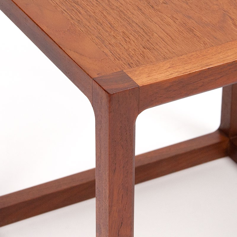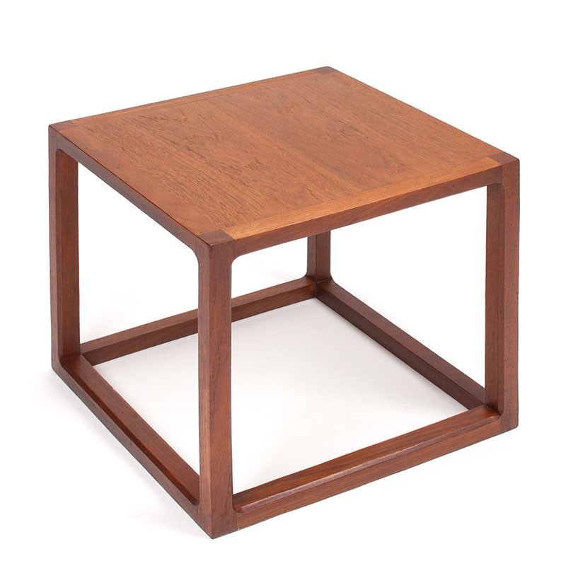 Design bijzettafel uit de vijftiger jaren. Prachtige kubus-vorm ontworpen door Kai Kristiansen voor Aksel Kjersgaard. De vintage bijzettafel is uitgevoerd in teakhout. De conditie is goed, geen kringen of krasjes, zie details. De afmetingen zijn 47x47x47 cm.